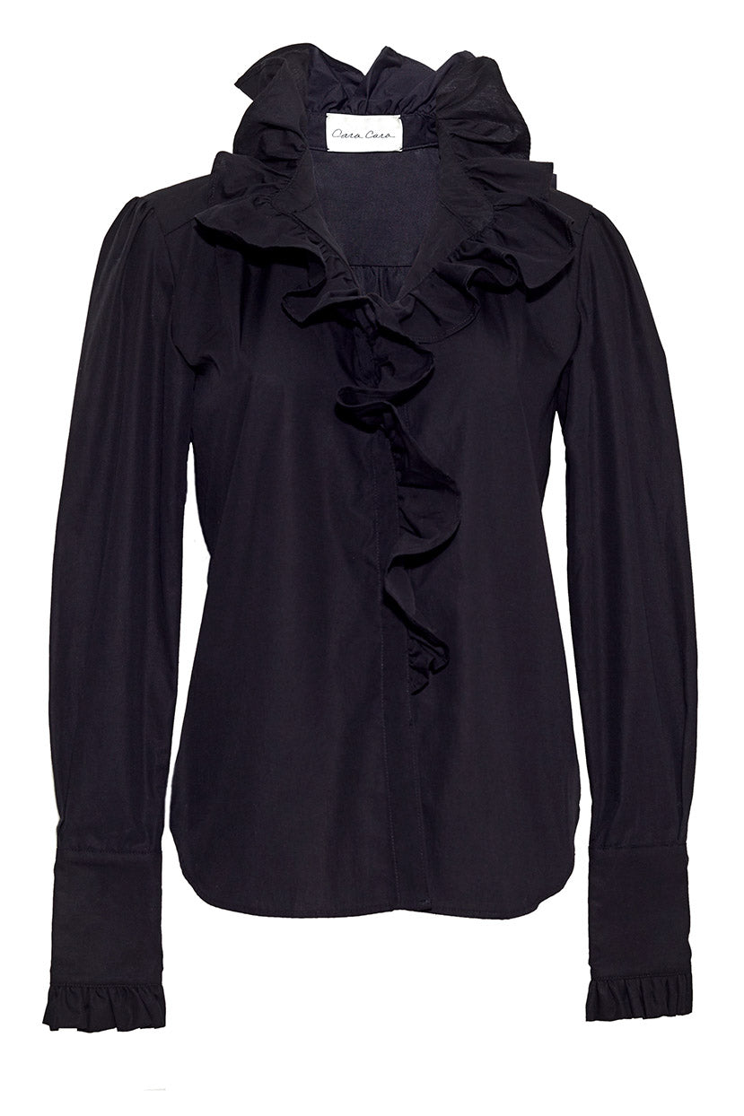 The new shirting capsule was created to add effortless glamour to casual looks. The Anne is our more elegant top, featuring a ruffle trim collared neckline, long sleeves and button cuffs and front.