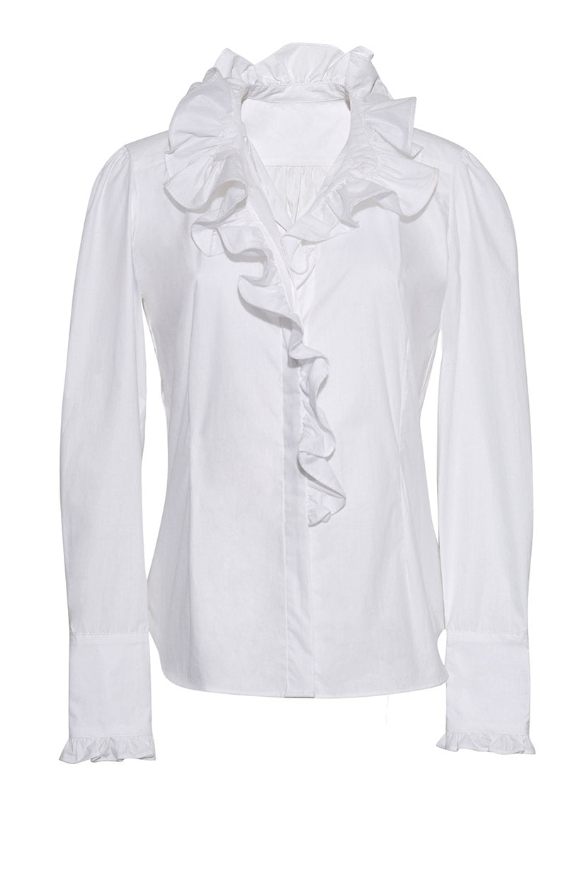 The shirting capsule was created to add effortless glamour to casual looks. The Anne is our more elegant top, featuring a ruffle trim collared neckline, long sleeves and button cuffs and front.