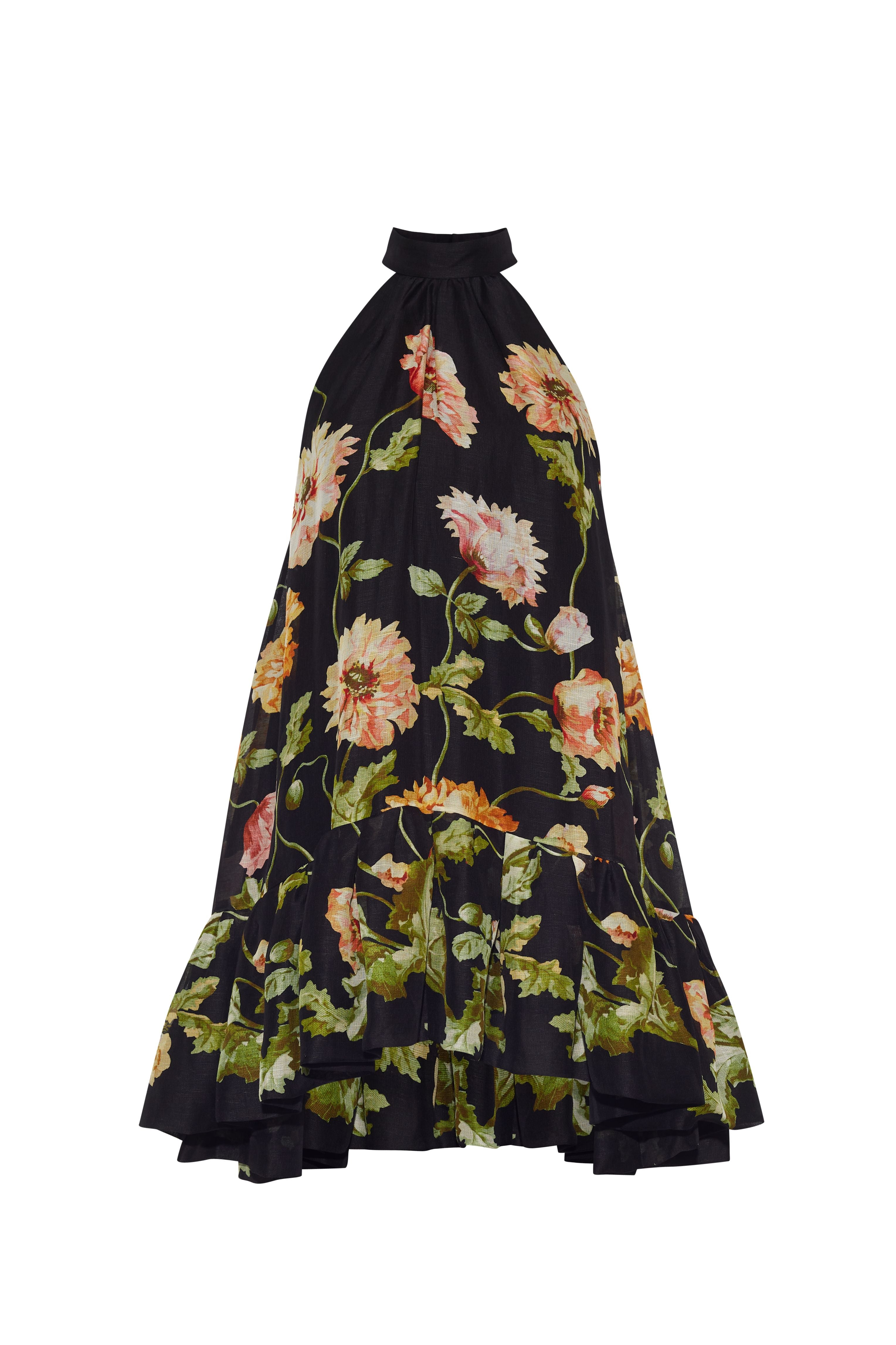 • Mock-neck halter printed mini dress with a high-low hem and ruffled bottom tier