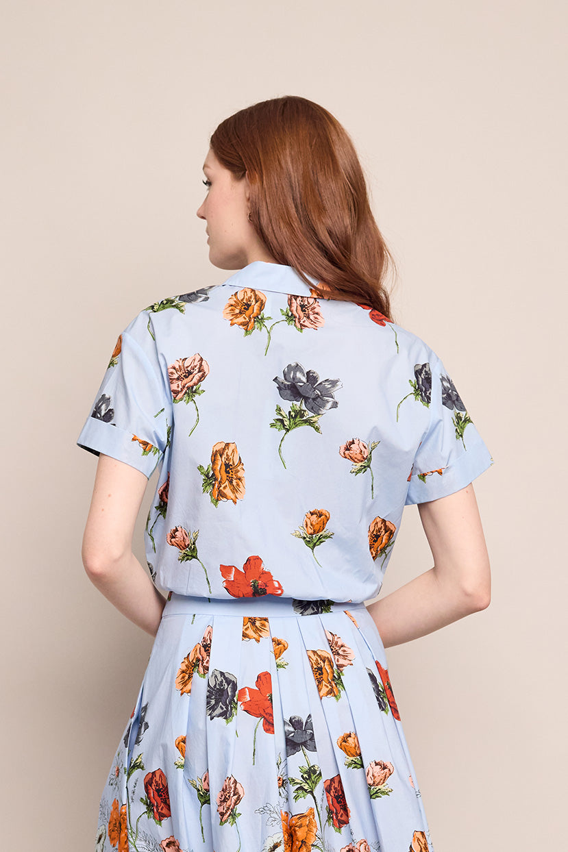 Cropped button down shirt with front button opening. Tie front bow detail. Short Sleeve with cuff. Elastic at back hem for adjustability. Unlined. Allover print.