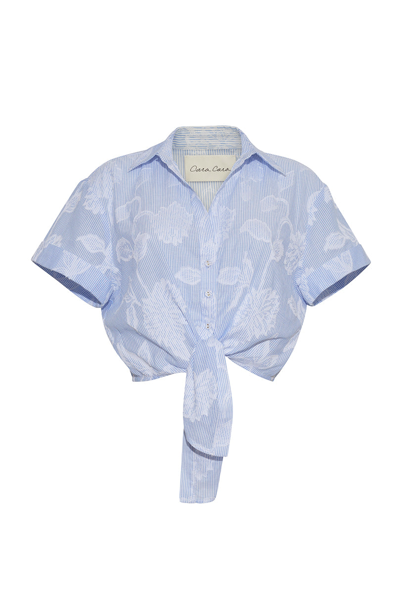 Cropped button down shirt with front button opening. Tie front bow detail. Short sleeve with cuff. Elastic at back hem for adjustability. Unlined. Striped floral fabric with textured details.