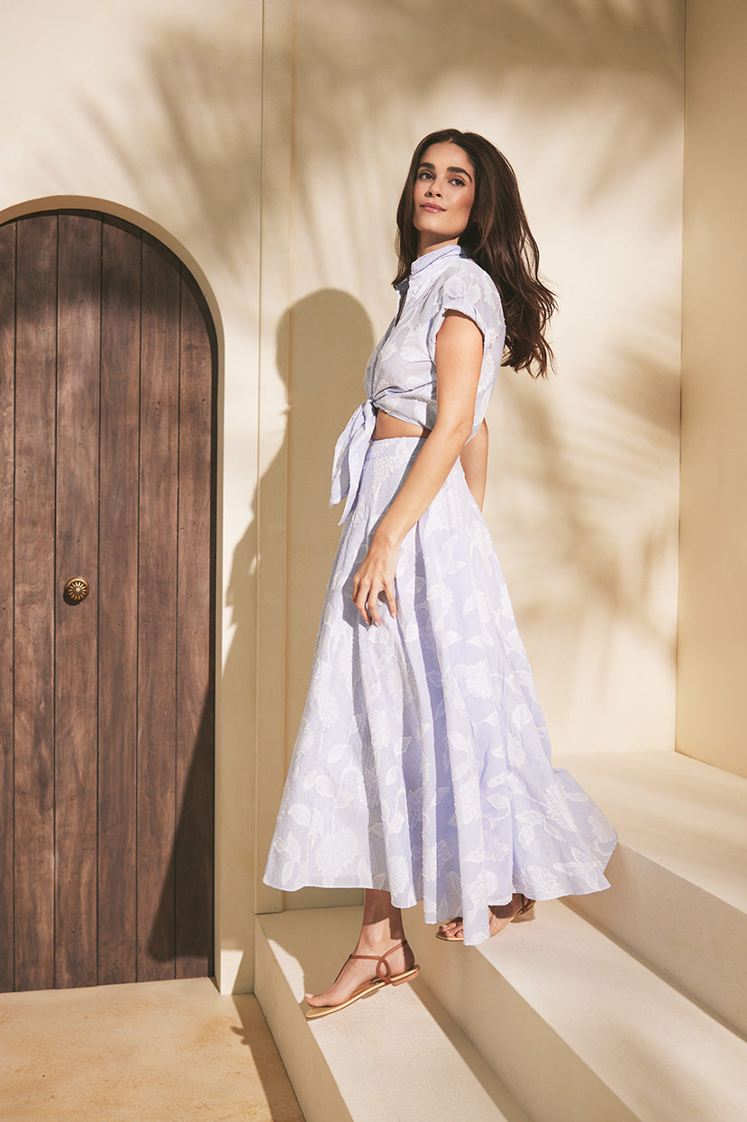 A reimagined classic short sleeve button up, the Asbury Top adds an extra dose of ease and glamour to an everyday basic. The cropped shirt features a button opening, cuffed sleeve and a front tie bow detail.