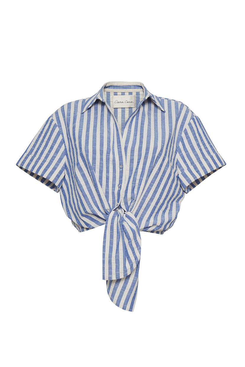 A reimagined classic short sleeve button up, the new Asbury Top adds an extra dose of ease and glamour to an everyday basic. The cropped shirt features a button opening, cuffed sleeve and a front tie bow detail.