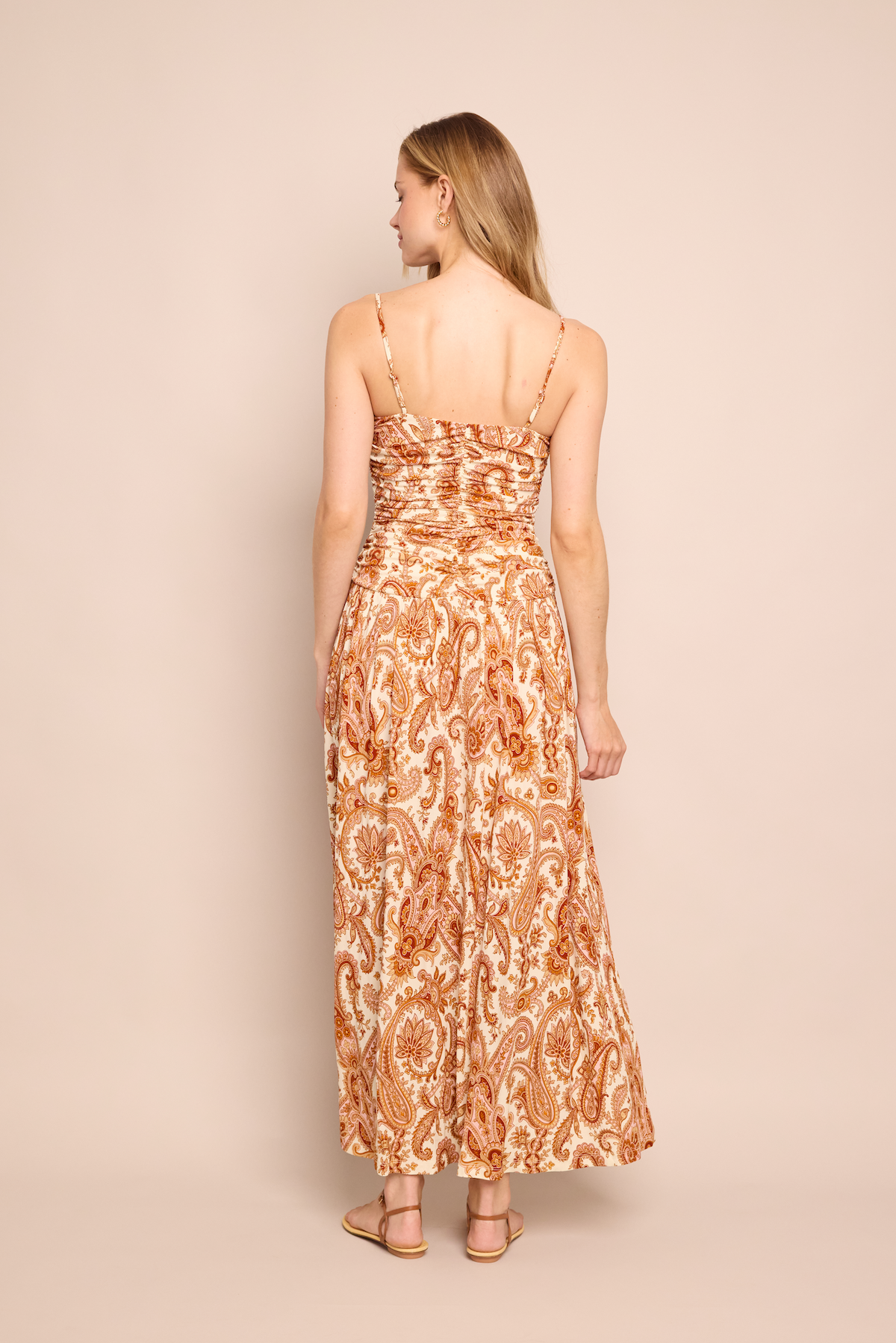 • Midi jersey dress with rouched bodice and adjustable spaghetti straps