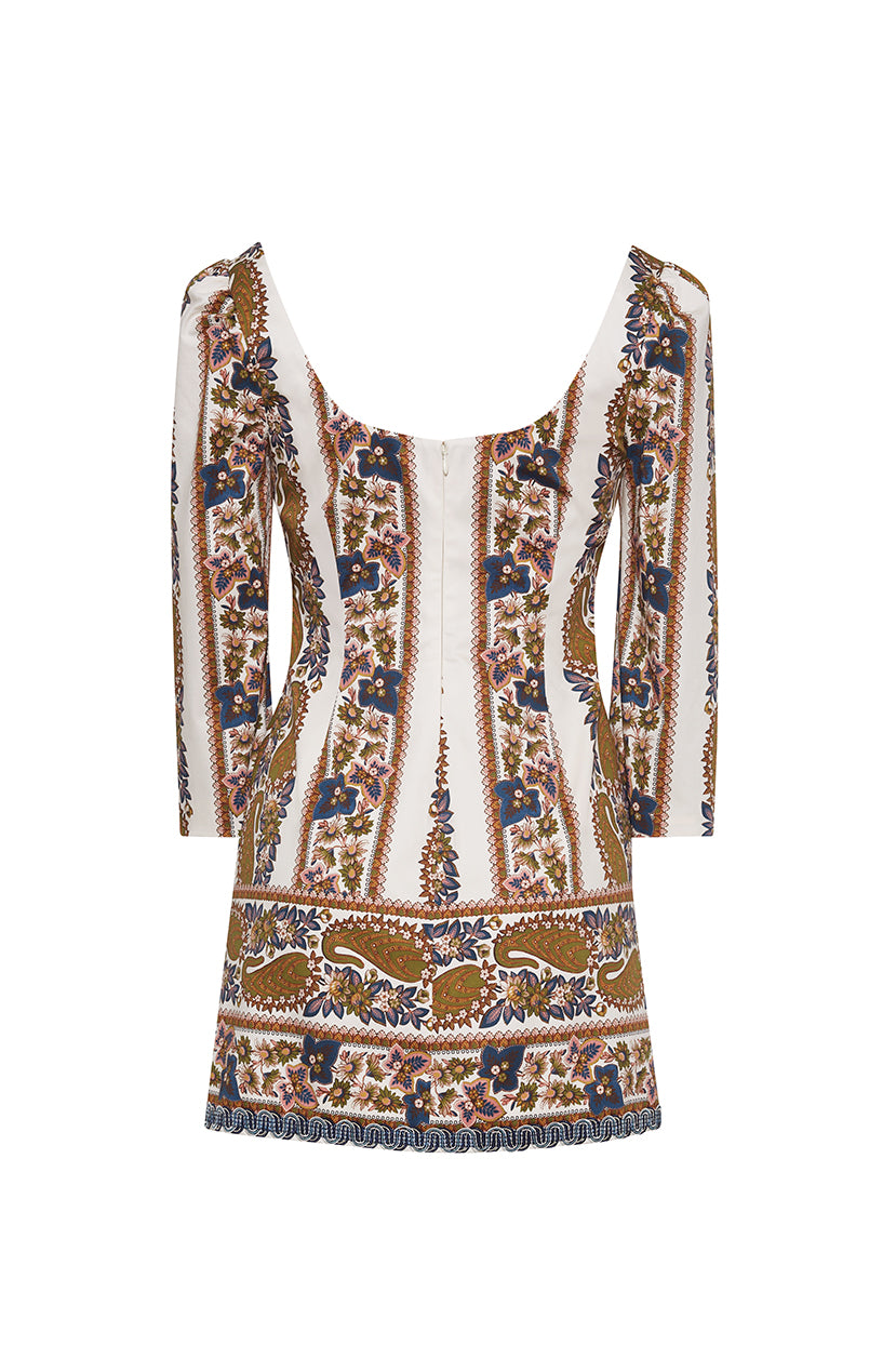 Slim fit. Square neckline. Three-quarter inside puff sleeves. Lined. Bra loop at internal shoulder seam. Waist darts and bust dart for shaping. Allover print.