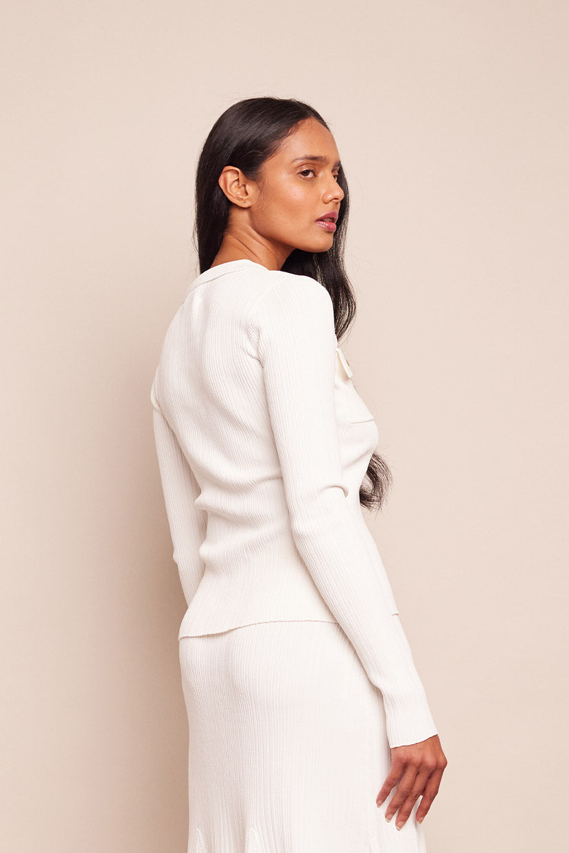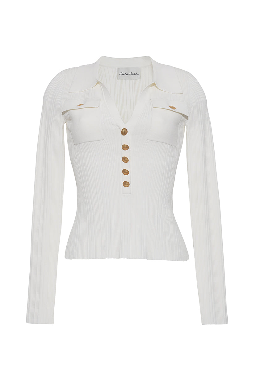 • Long sleeve fitted v-neck collared variegated rib knit top