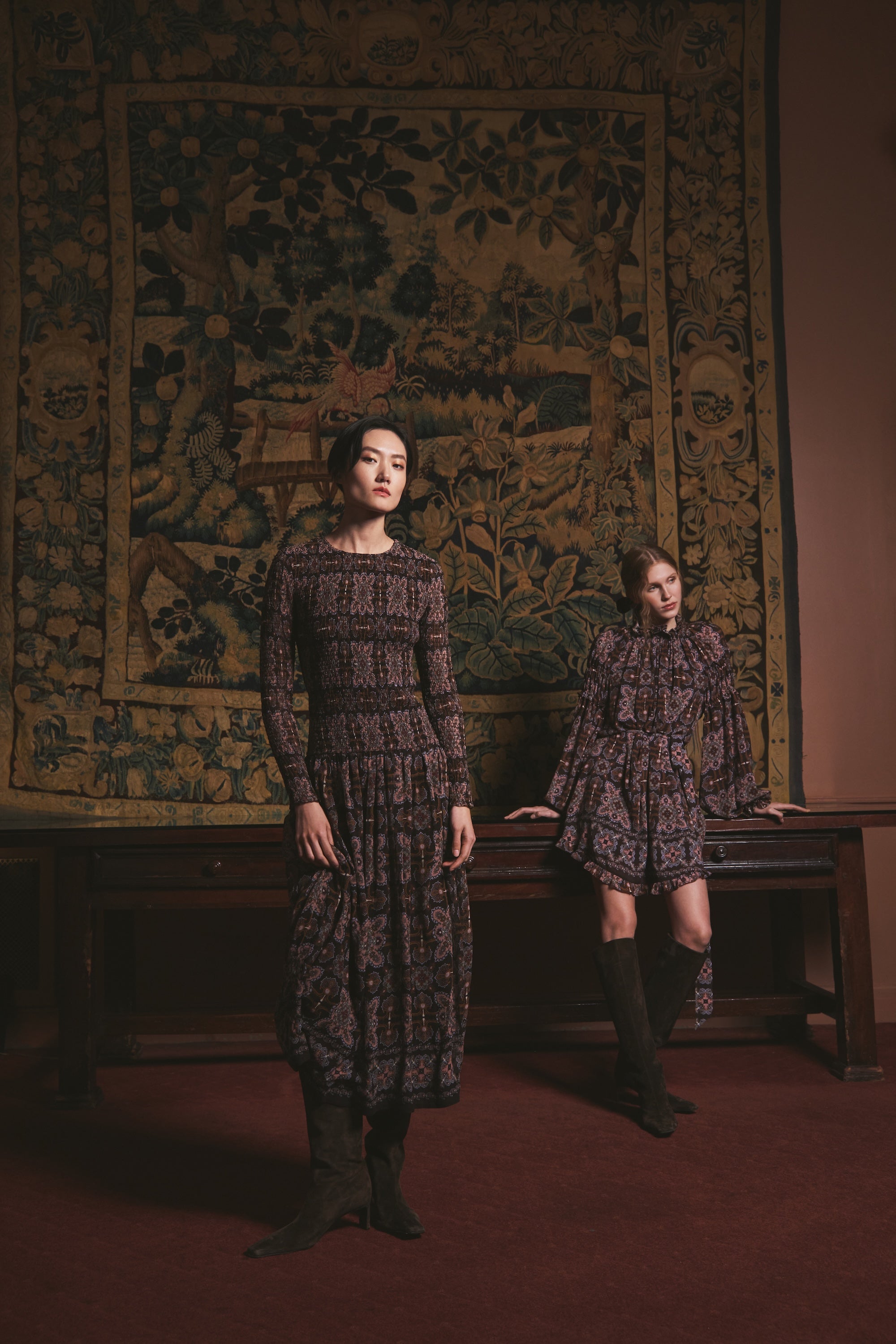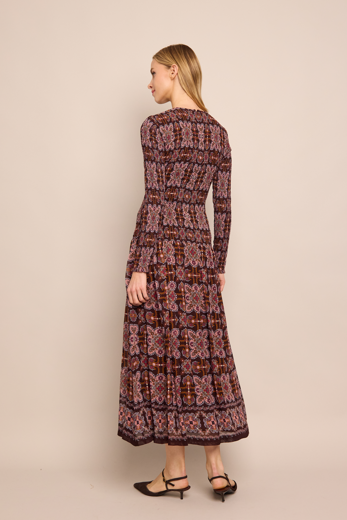 • Fully smocked bodice and long sleeve crewneck midi dress with drop-waist and gathering below waist seam