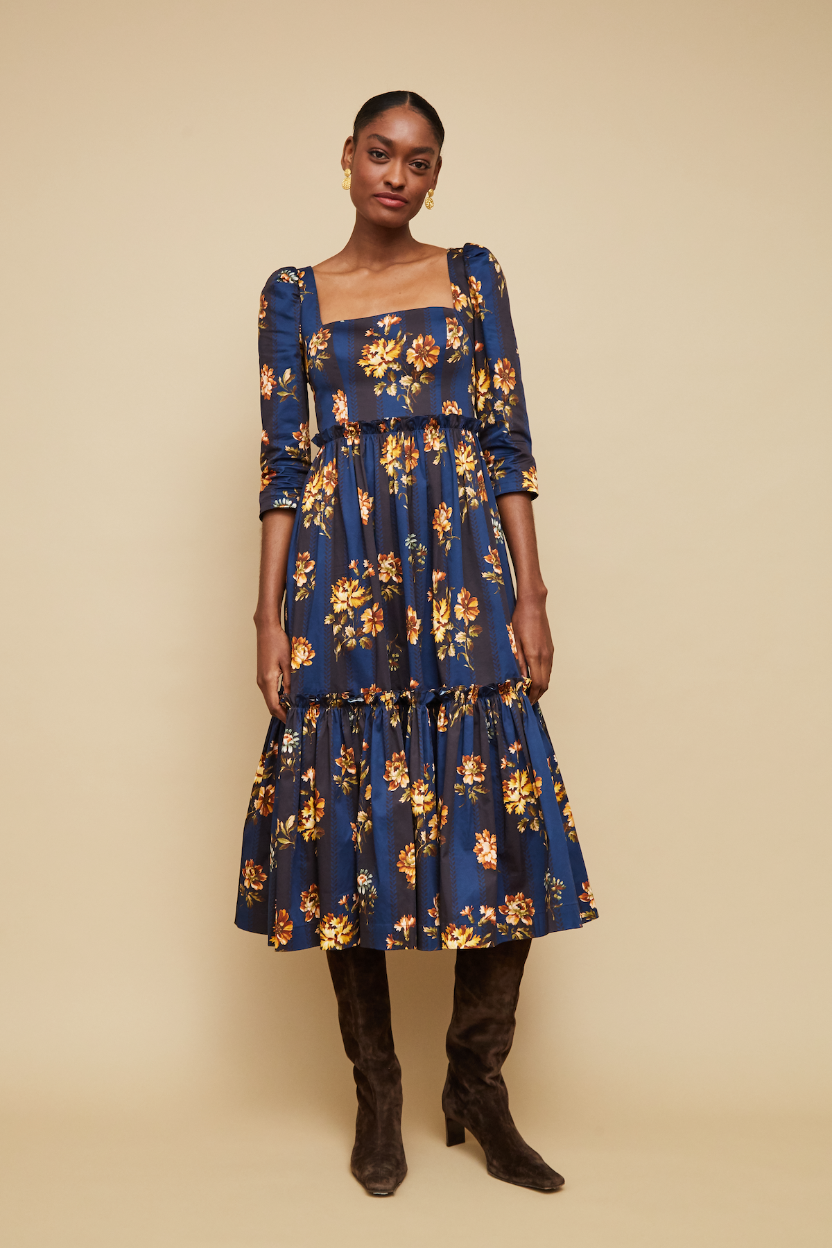 Designed in a dazzling striped floral print, the refreshed cotton sateen Blue Hill cuts an elegant silhouette with structured sleeves and a ruffle tier. Pair with heels and jewels for an evening out or ankle boots for casual days.