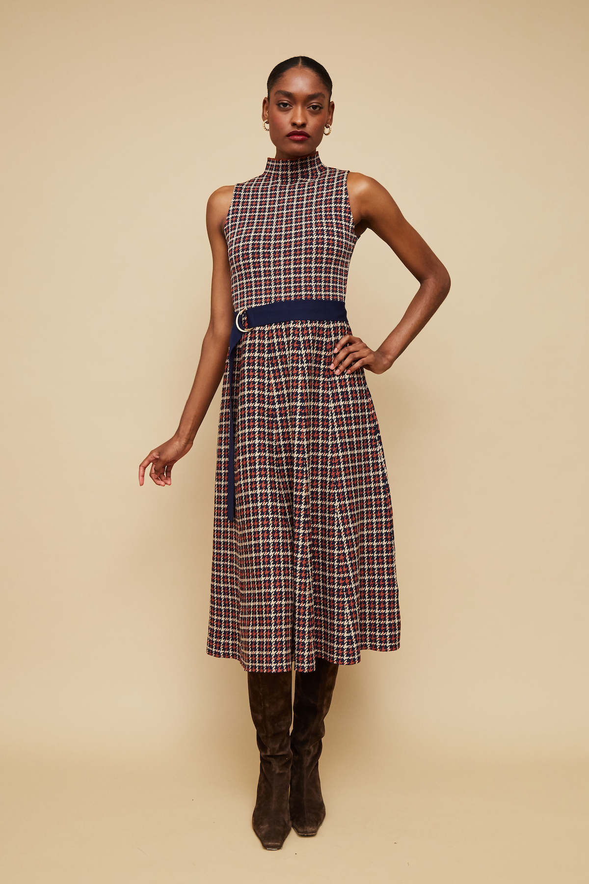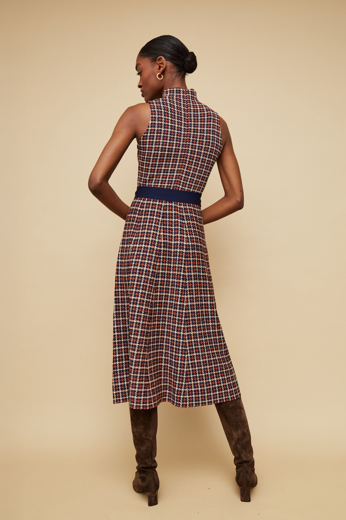 • Funnel-neck sleeveless flared midi dress with fashioned plaid knit jacquard
