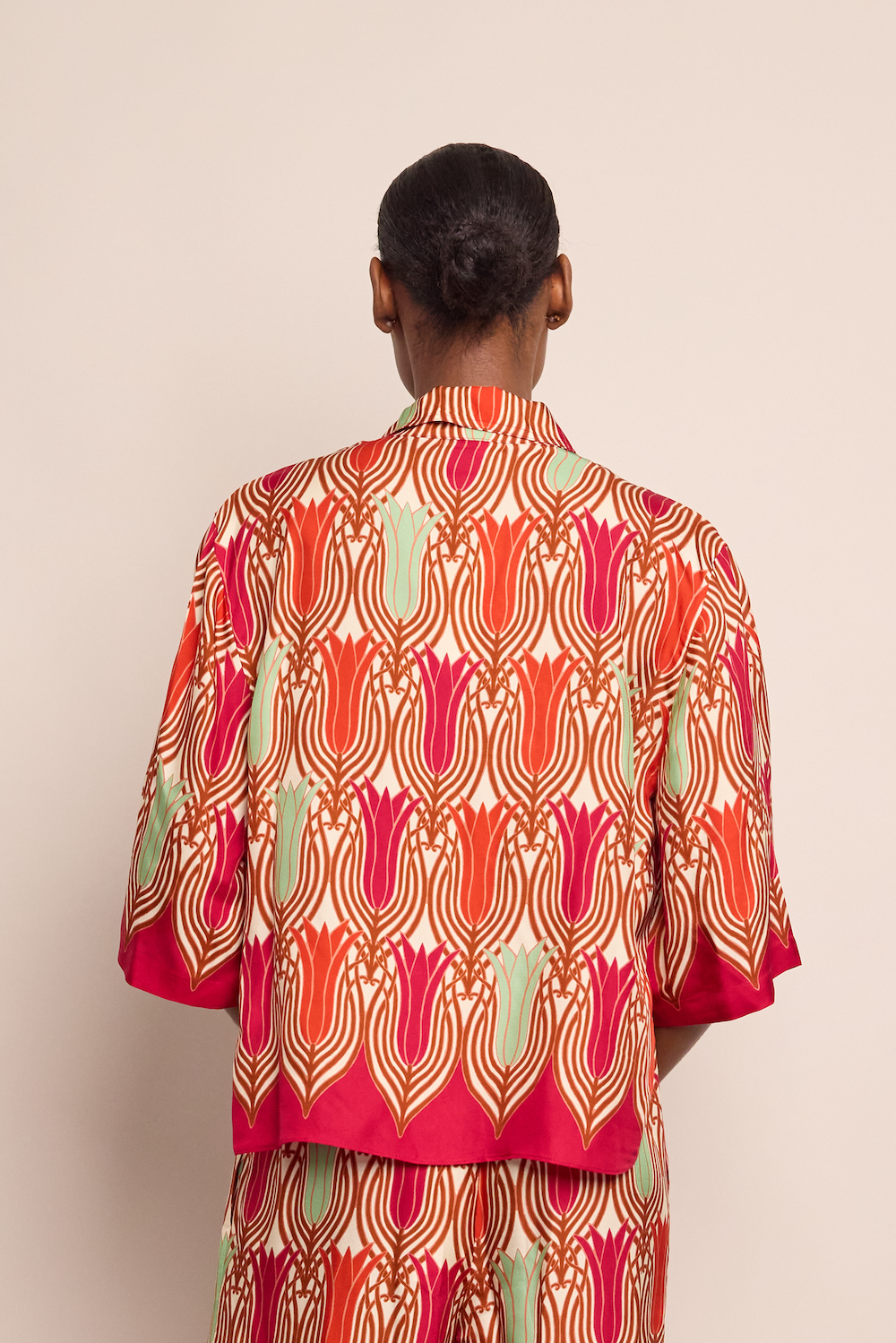 • Easy, flowy silk twill, collared, button down camp shirt with 3/4 sleeves