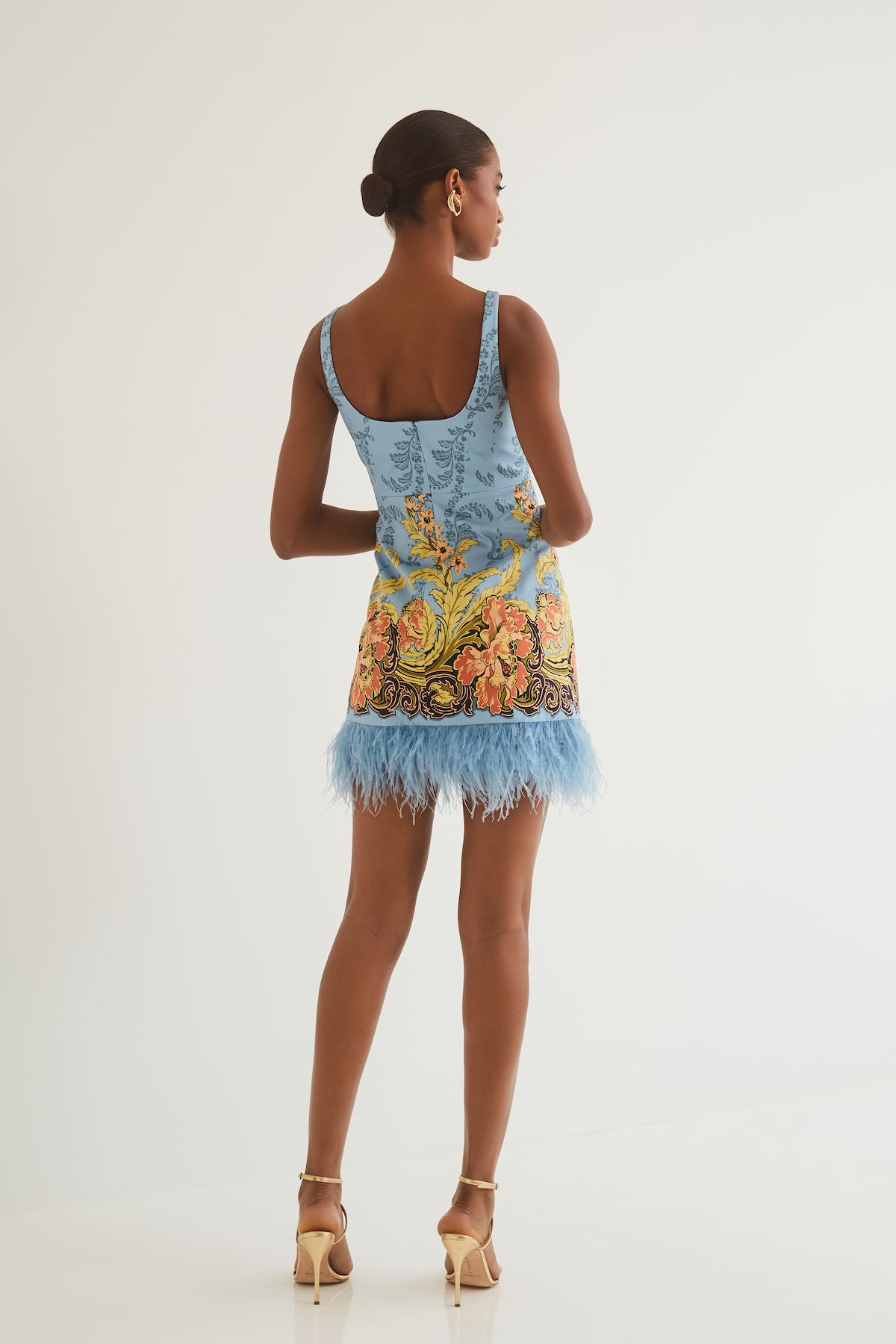 • Mini square neck tank dress with decorative ostrich feathers at hem
