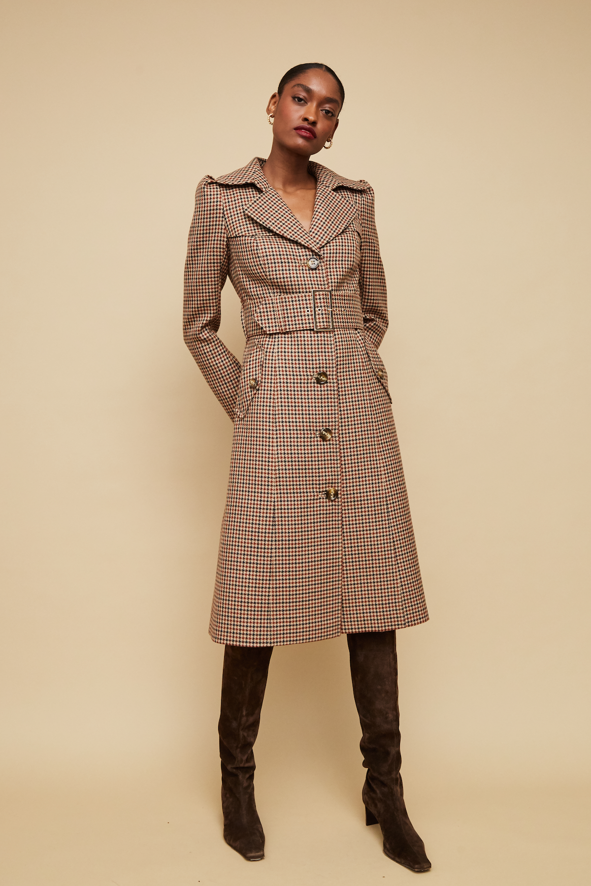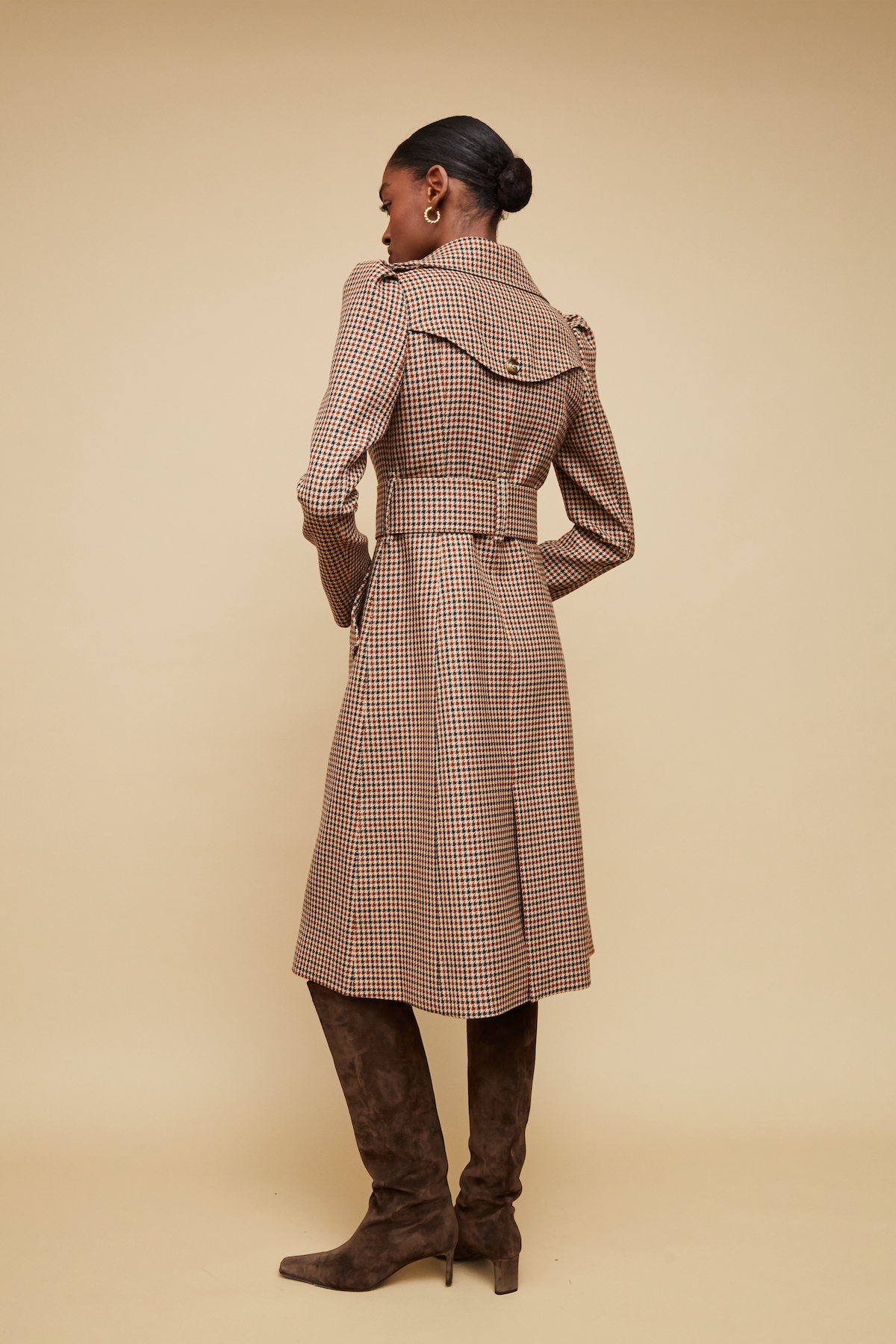 • Midi length houndstooth plaid trench coat with wide belt and large rectangular belt buckle