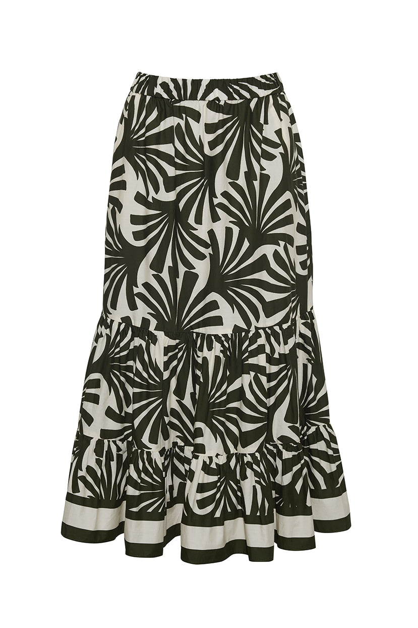 Pull on. Double tiered midi skirt with elastic waistband. Placed print.