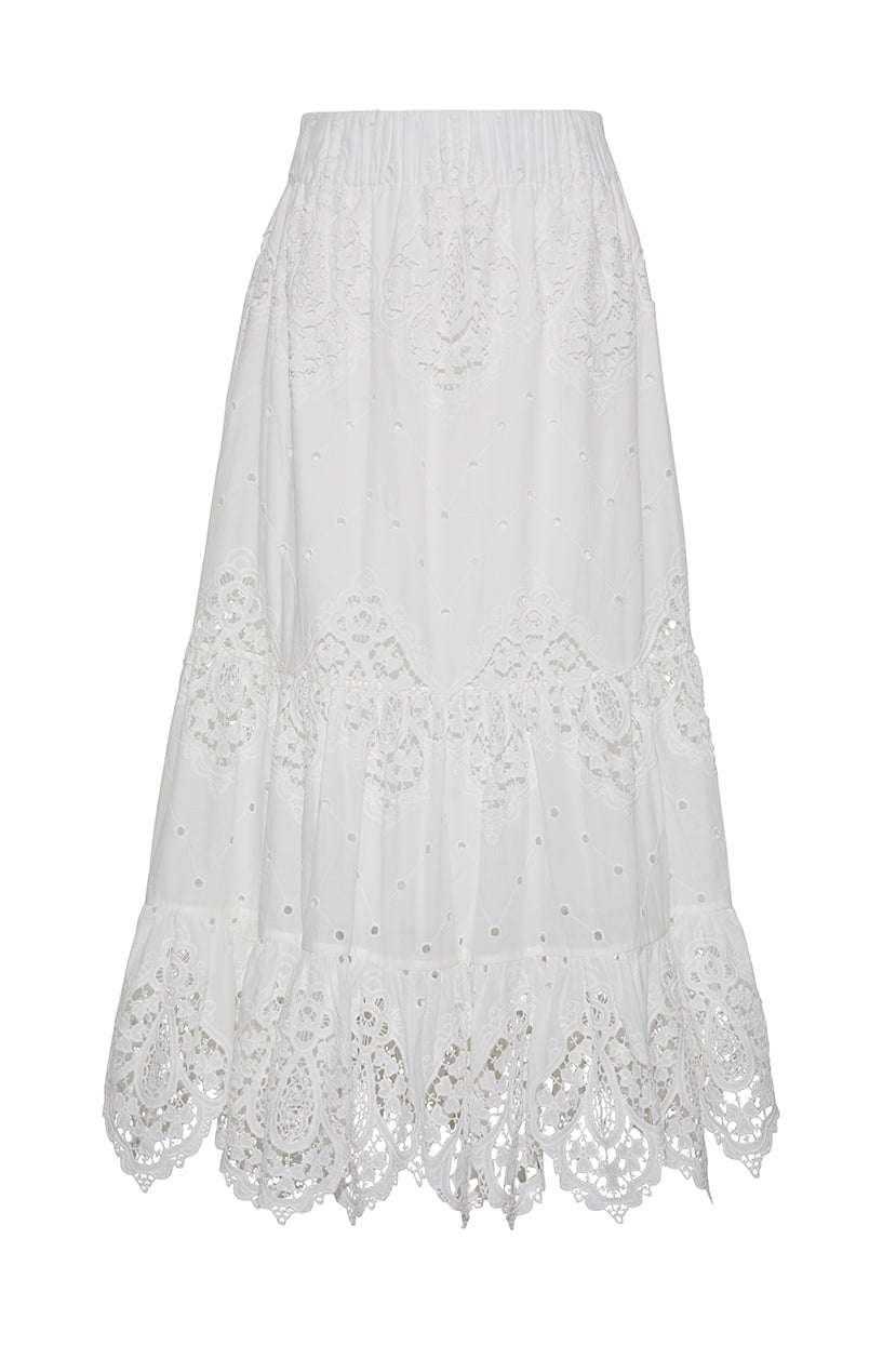 Pull on. Double tiered midi skirt with elastic waistband. Lined. Chevron eyelet detail placed at tiers. Hem is finished in scallop eyelet detail.