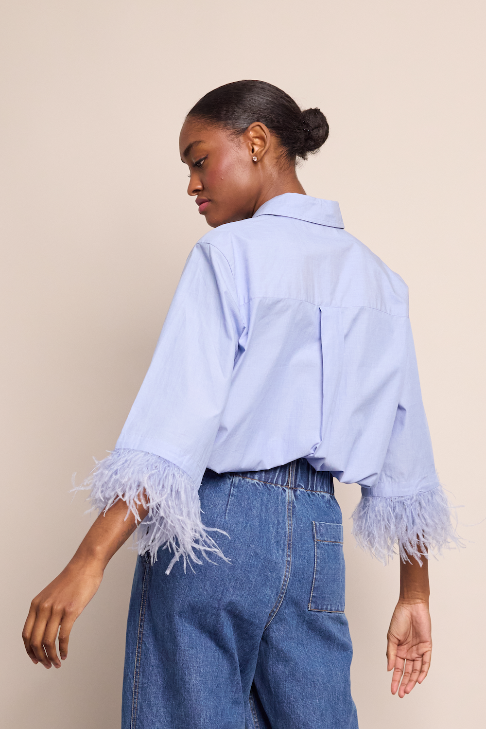 • Button down shirt with feather trim detail at sleeve hem