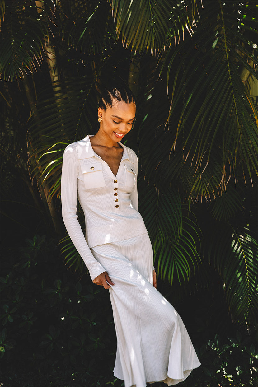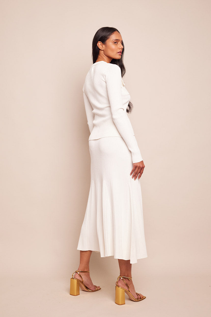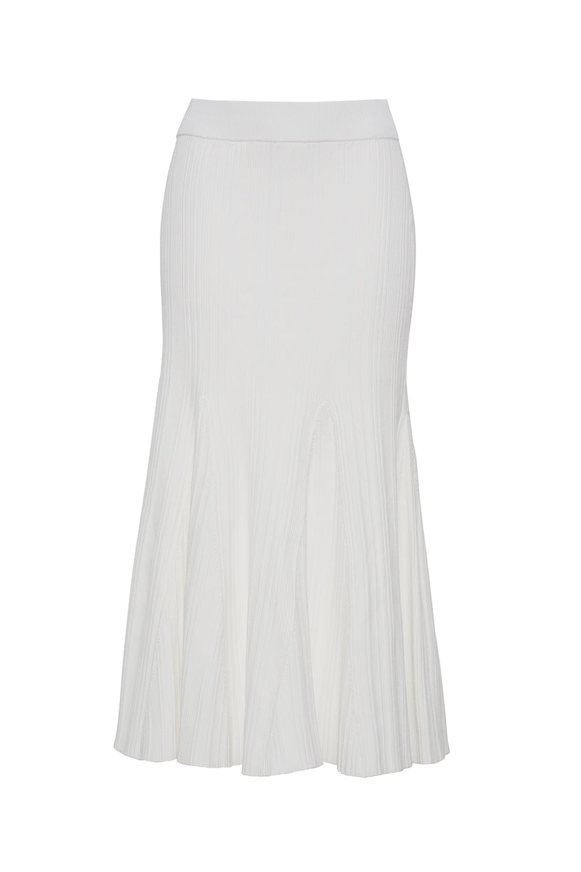• Elastic waist midi length variegated rib knit trumpet skirt
