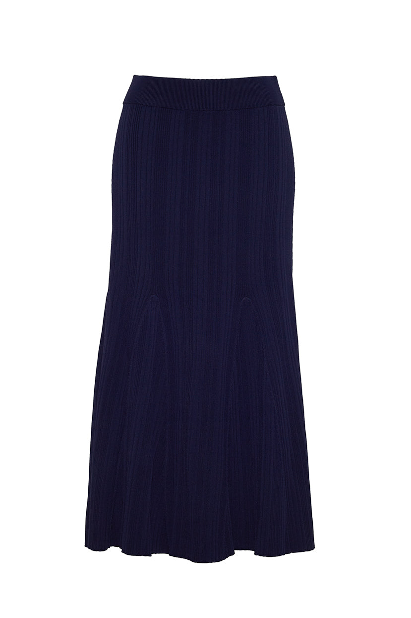• Elastic waist midi length variegated rib knit trumpet skirt