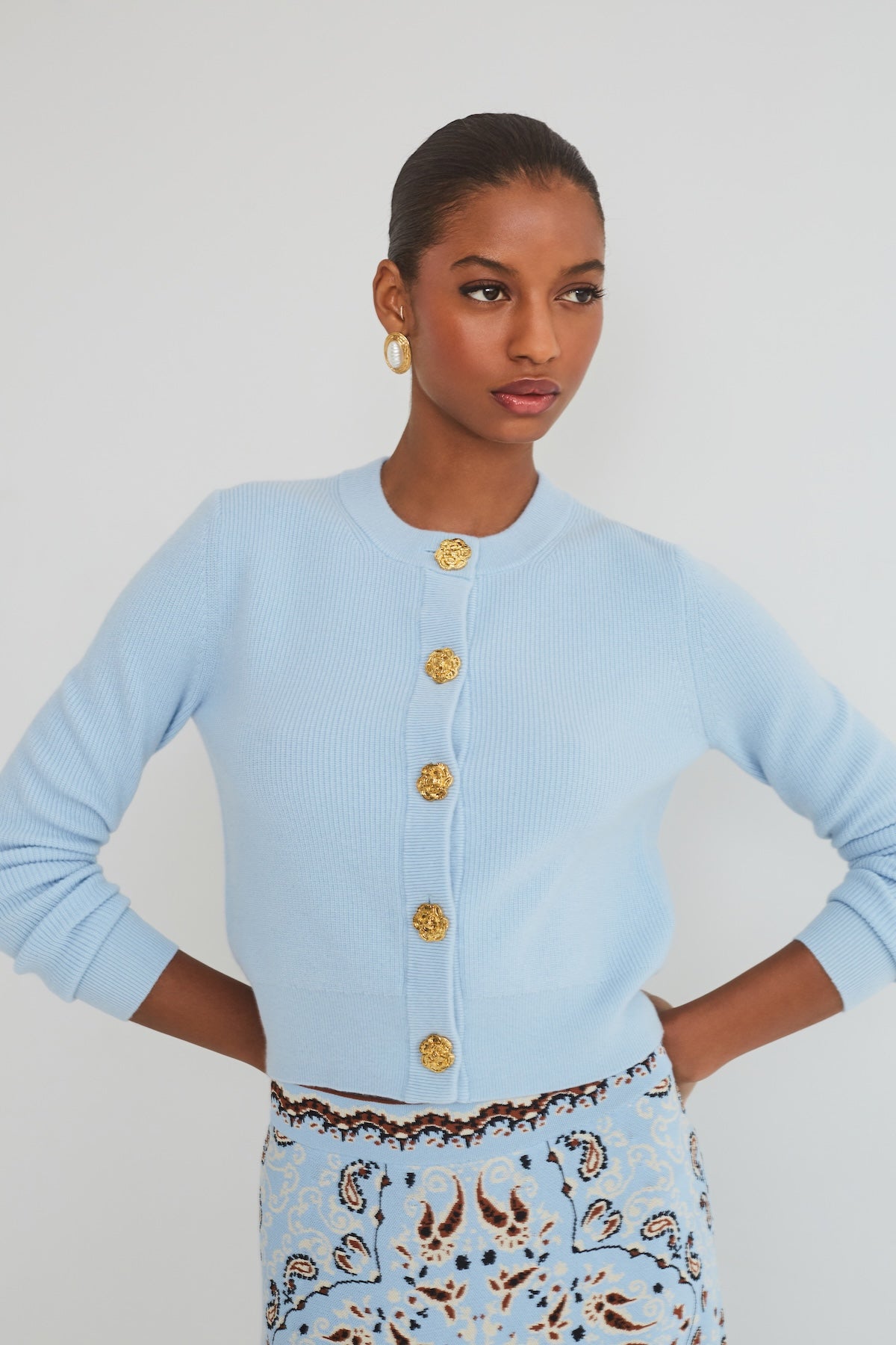 • Crewneck fitted long-sleeve cardigan with novelty gold floral buttons