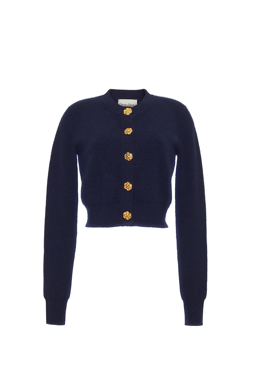 • Crewneck fitted long-sleeve cardigan with novelty gold floral buttons