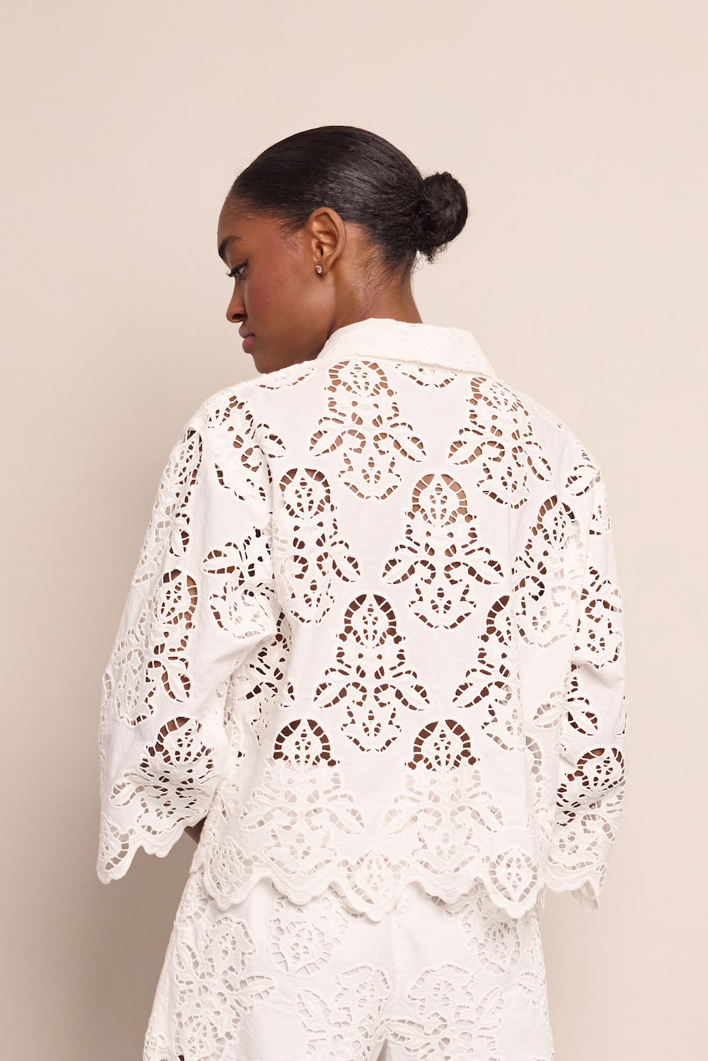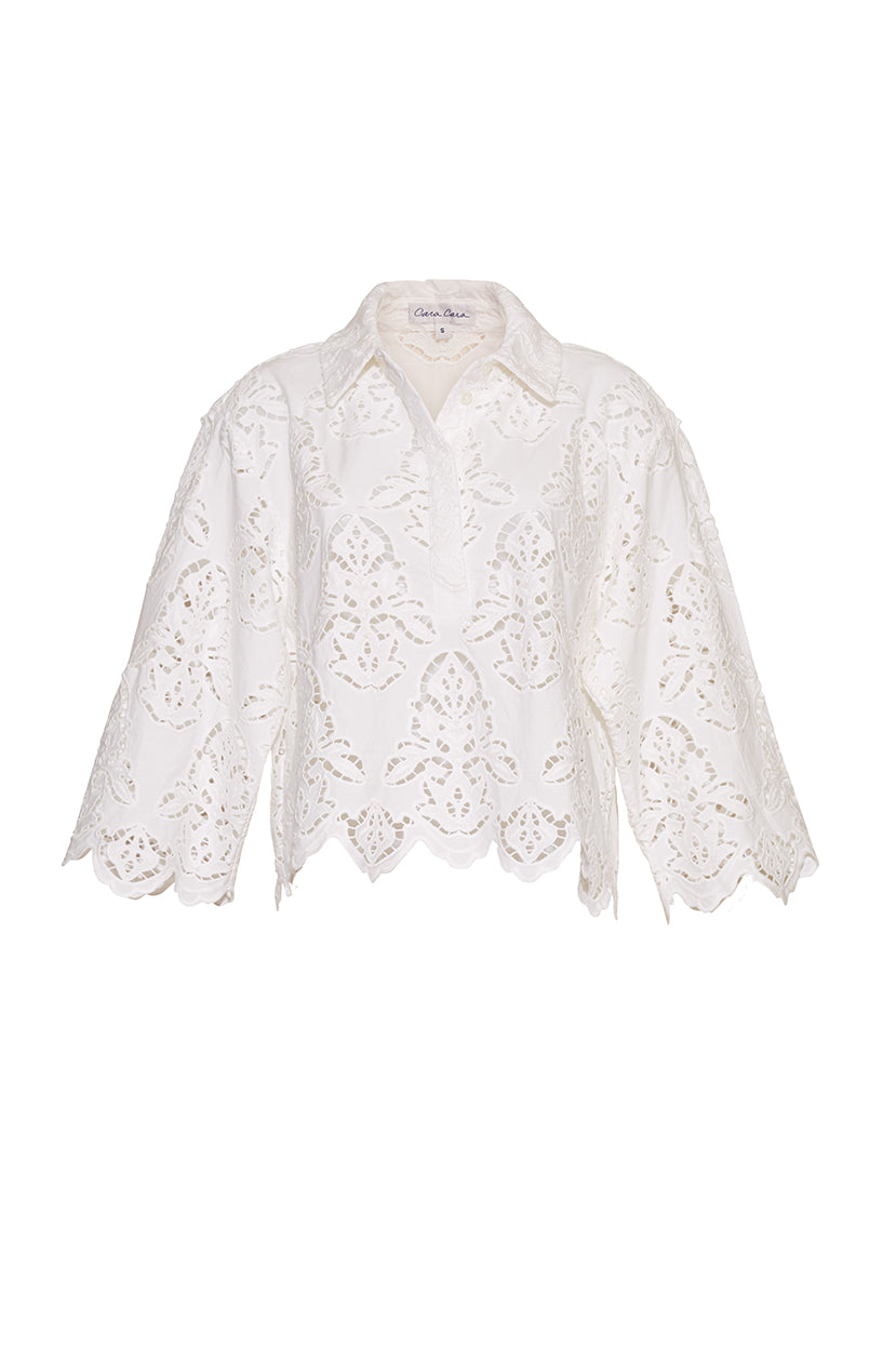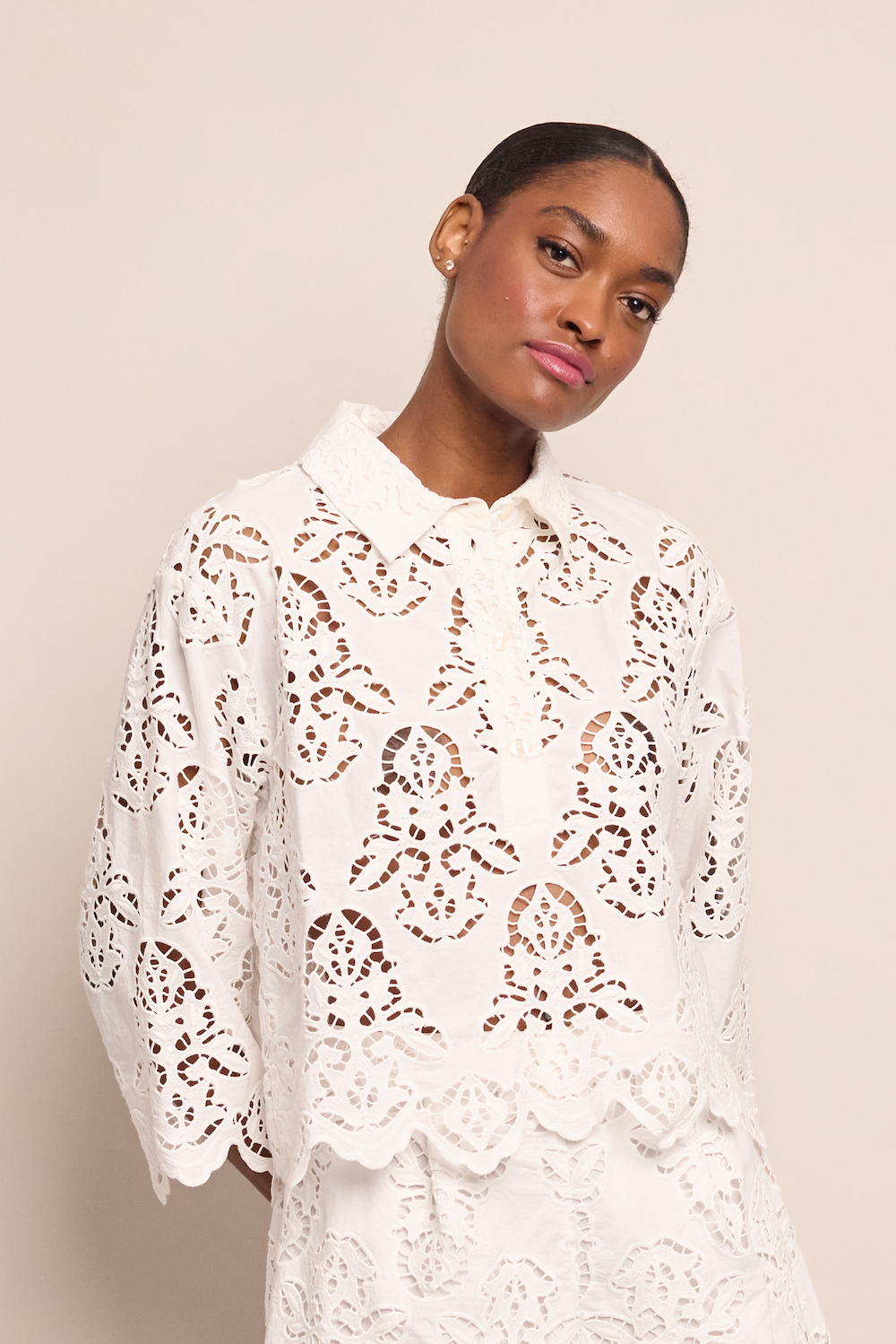 • Body and sleeve hem feature decorative scallop detail
