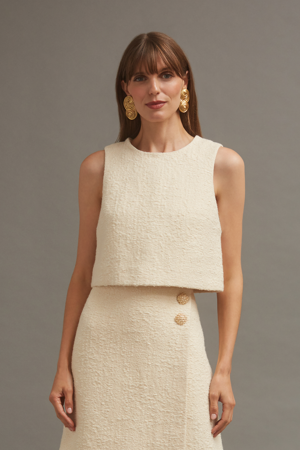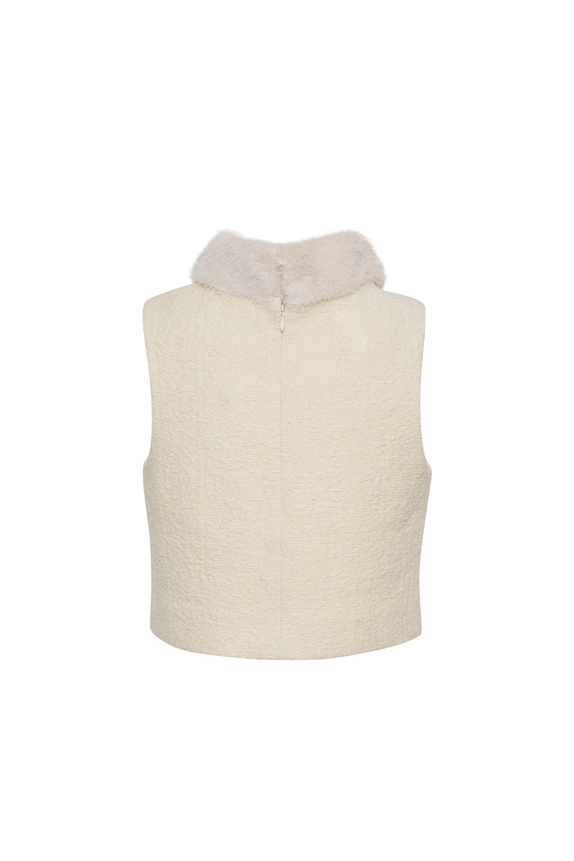 • Sleeveless Italian boucle shell top with detachable faux fur collar