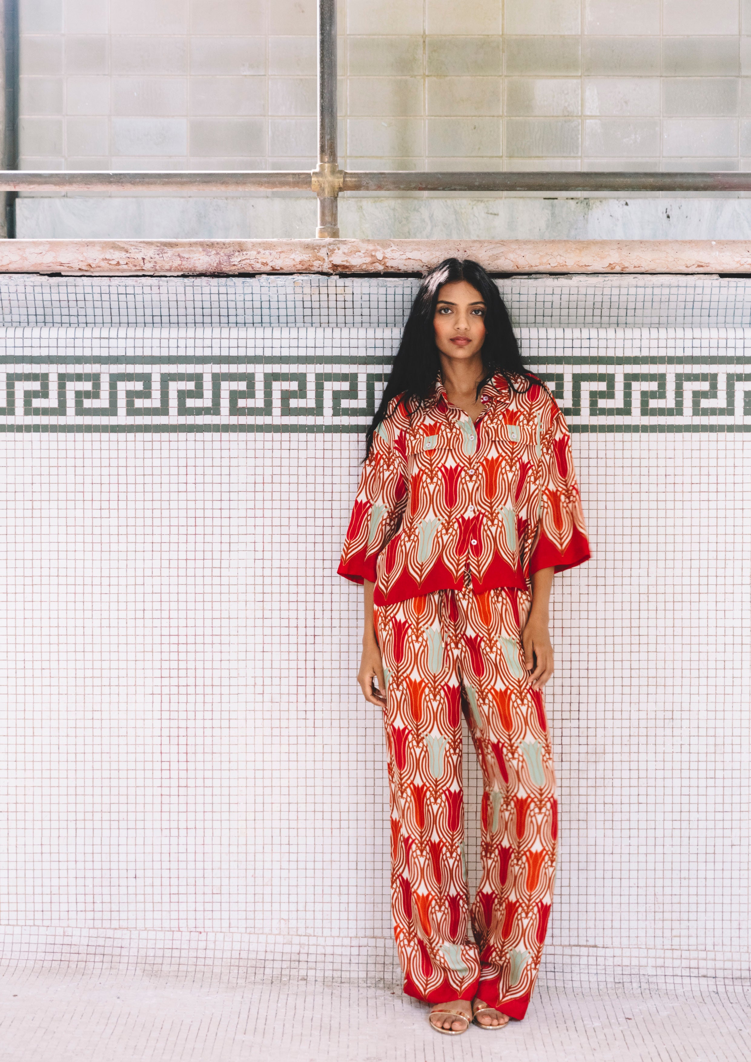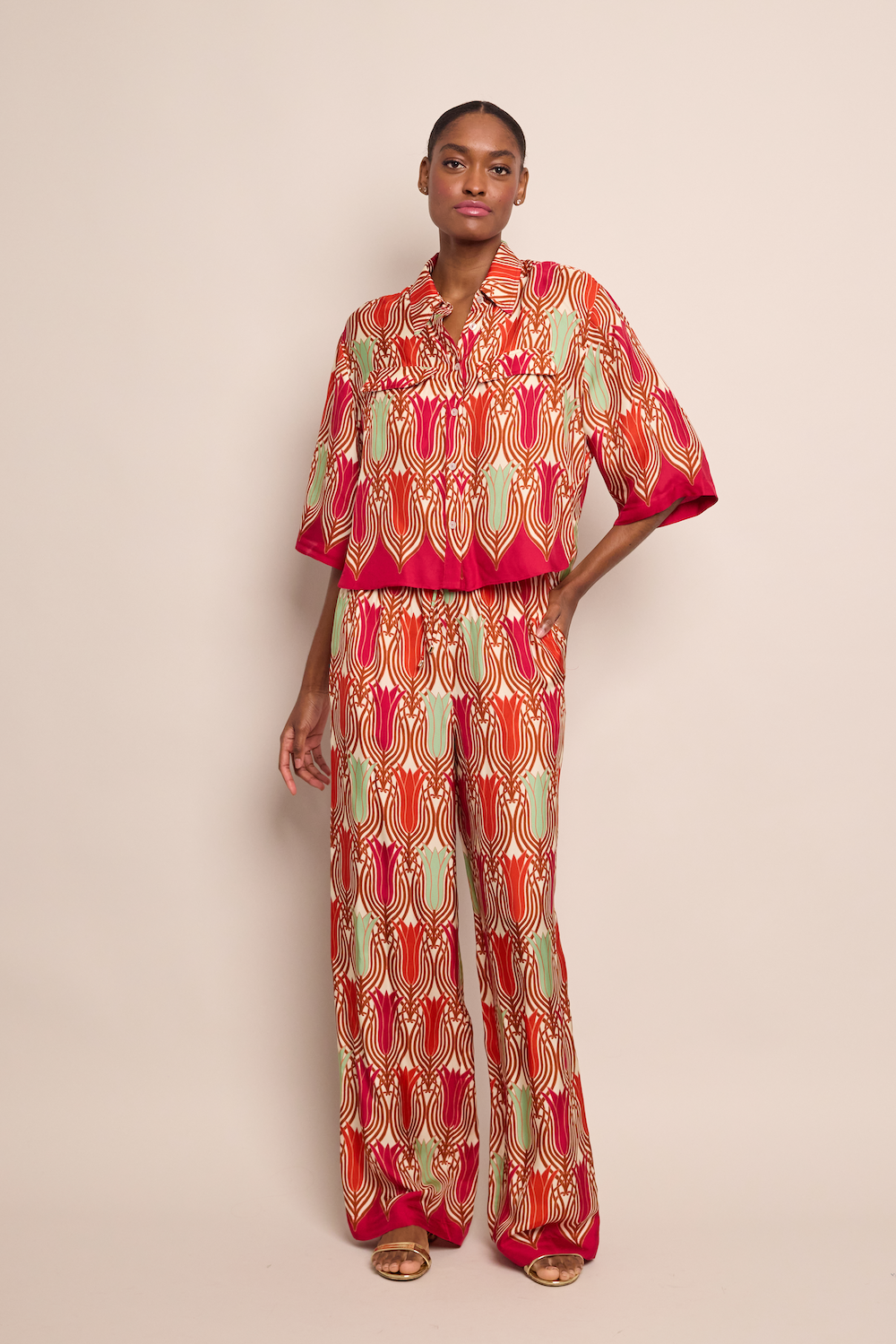 • Easy, flowy pull on drawstring pants with adjustable ties and gold cord ends