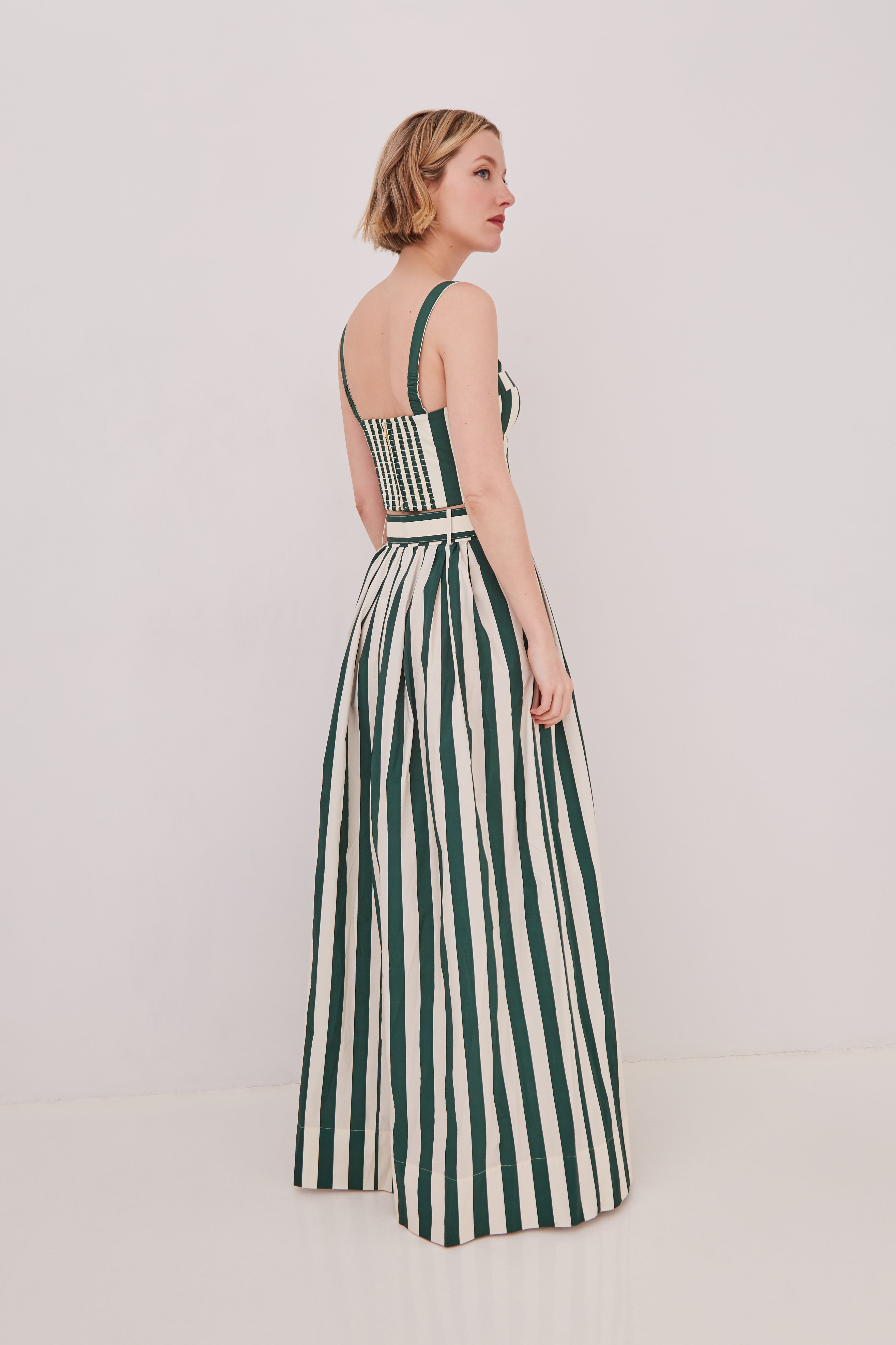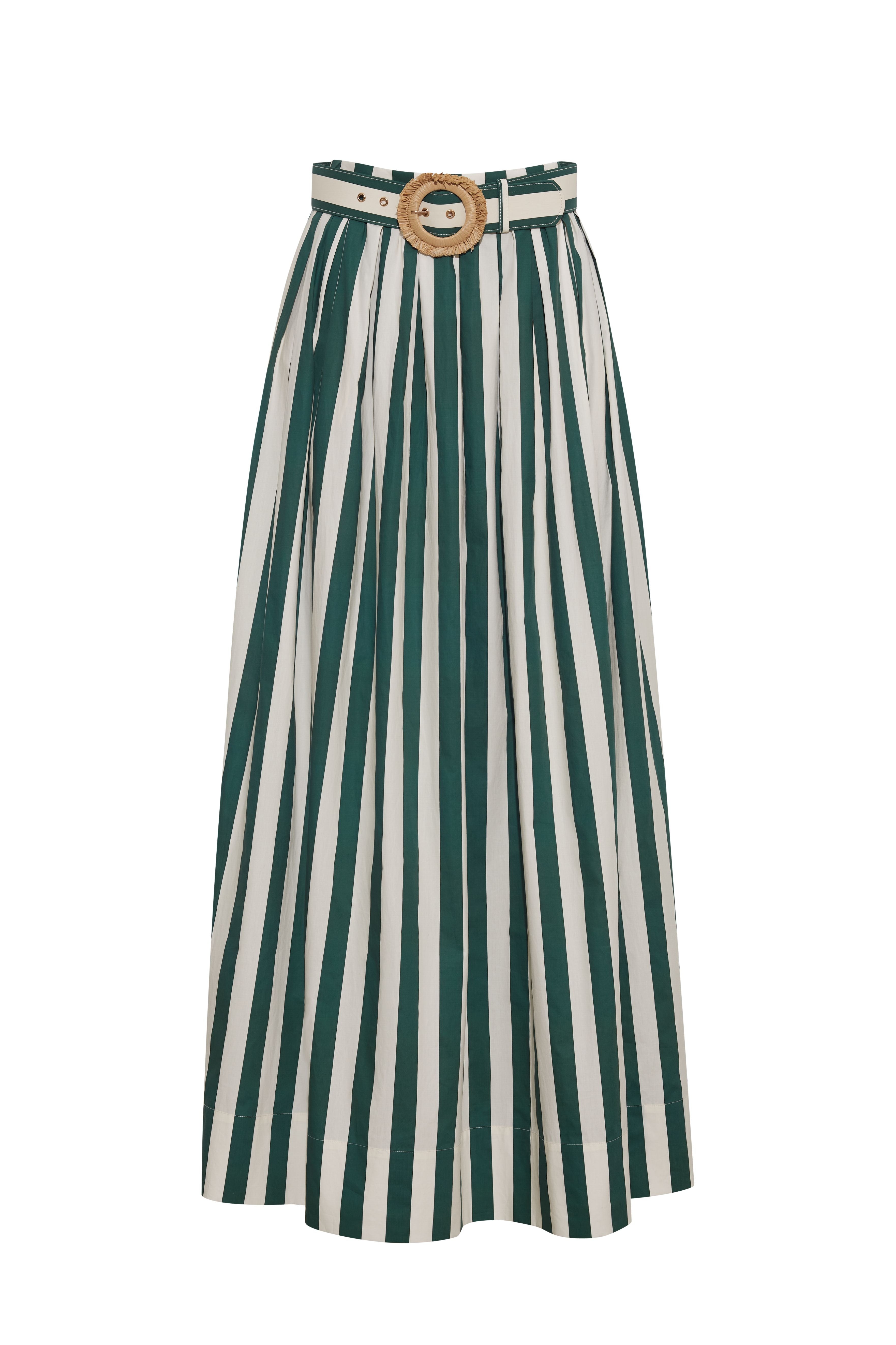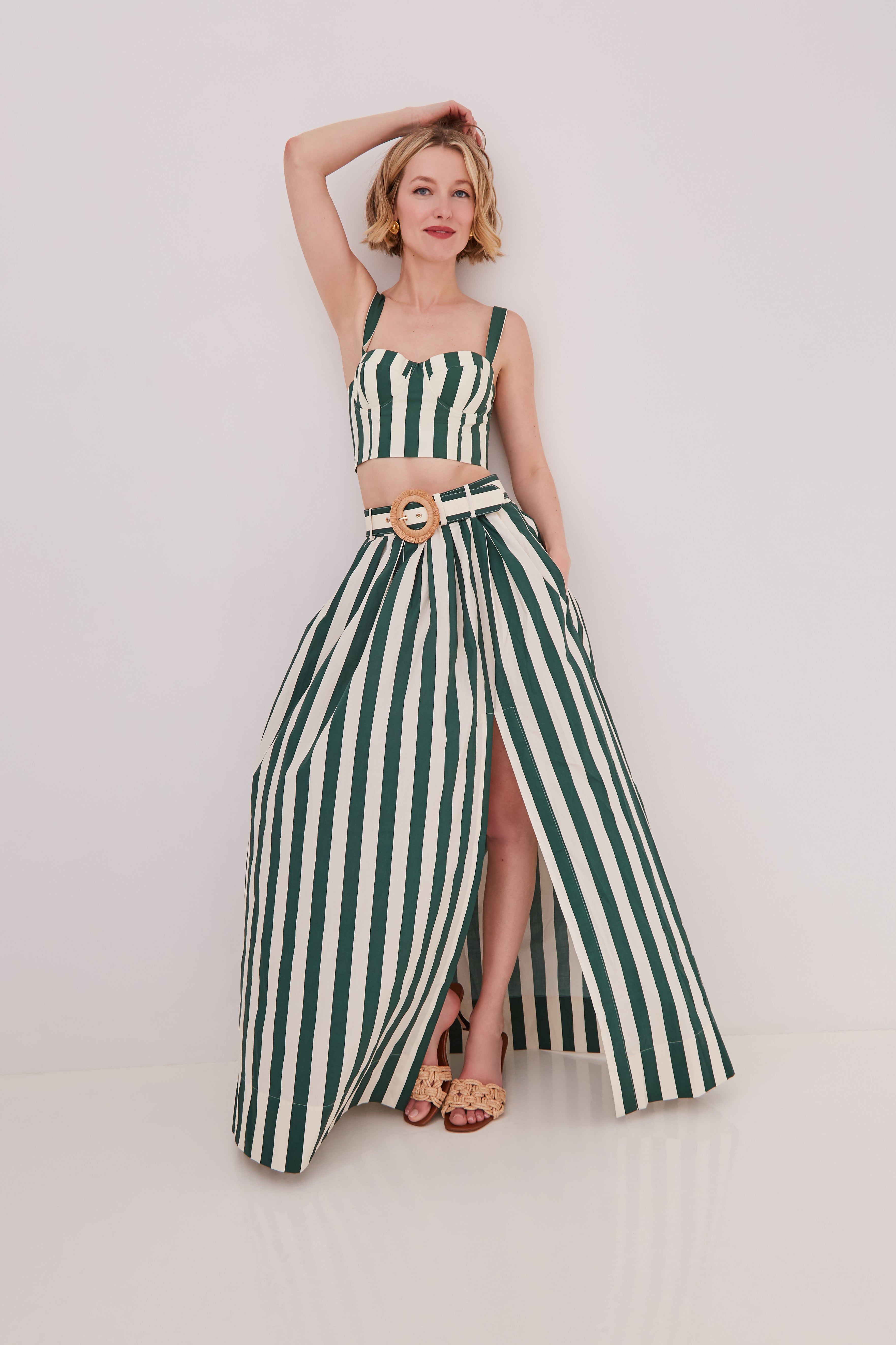 • Voluminous maxi skirt with slit and self belt with raffia belt buckle