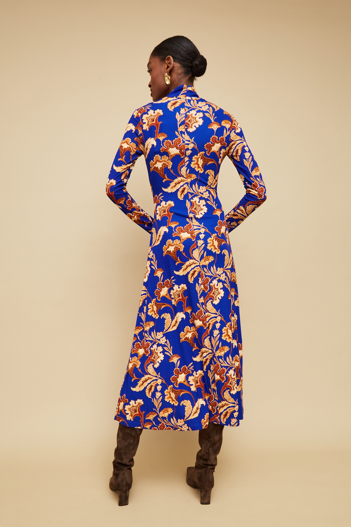 • Long sleeve funnel-neck dress with draped waist and voluminous hem