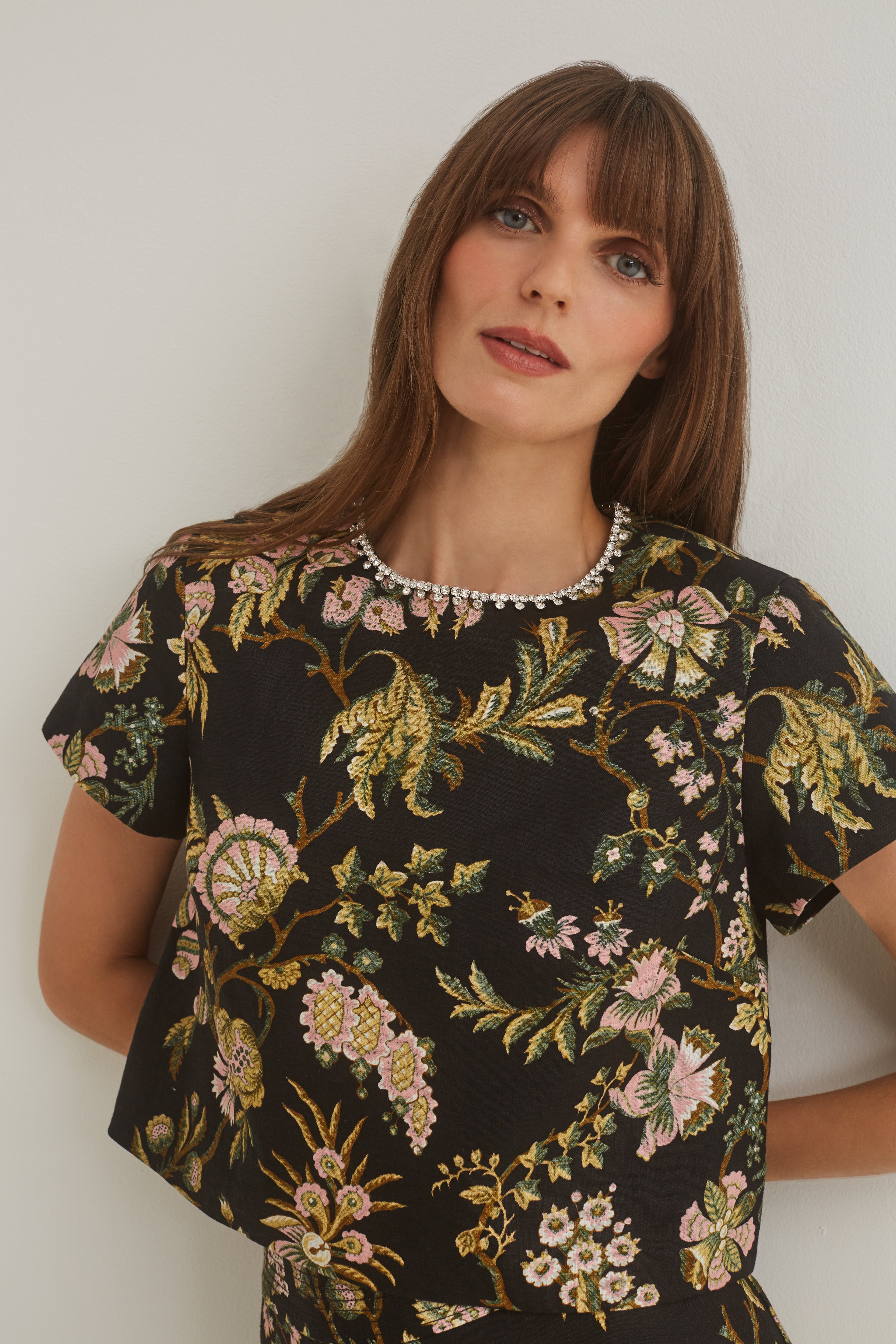 • Short sleeve cropped top with embellished novelty rhinestone with silver metal trim around neckline