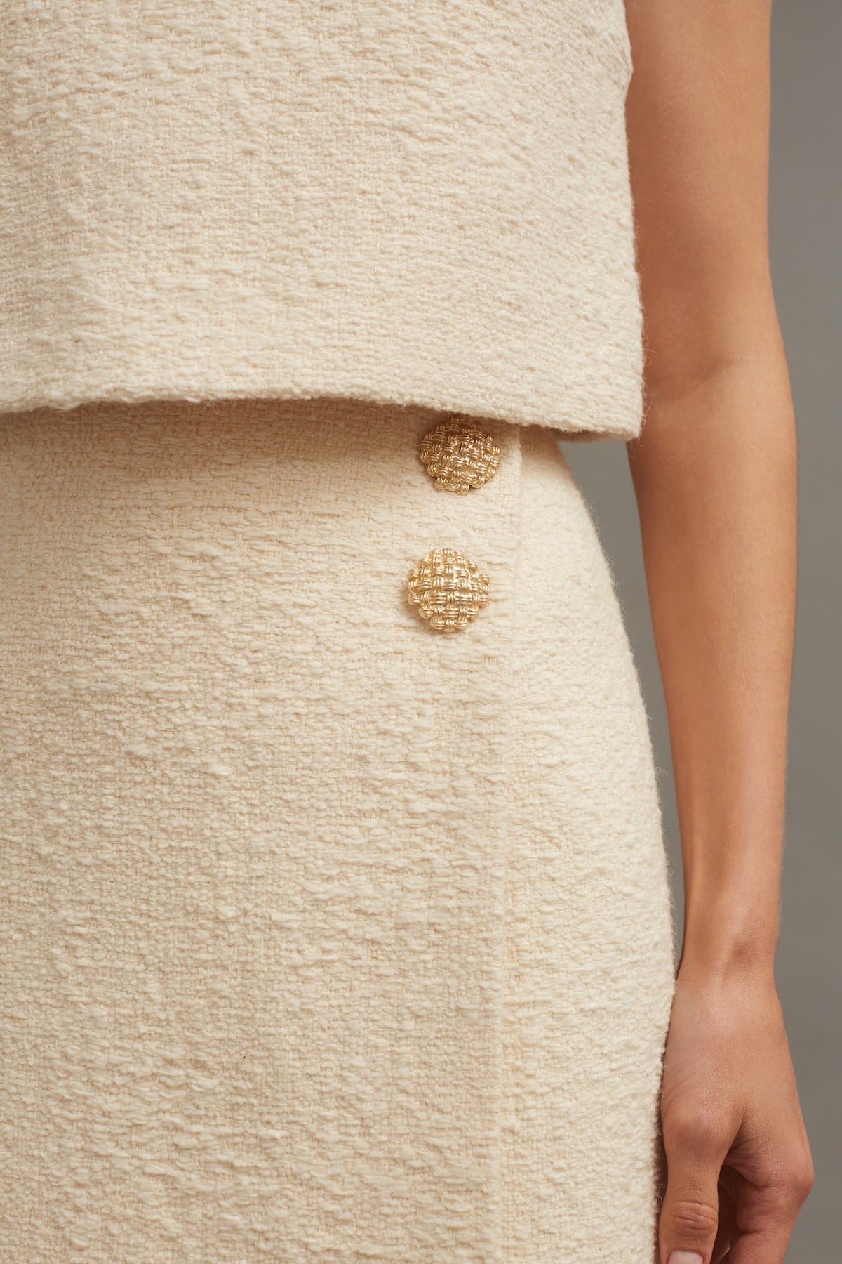 • Wrap Italian boucle midi skirt with gold novelty buttons at front and metal snaps on interior