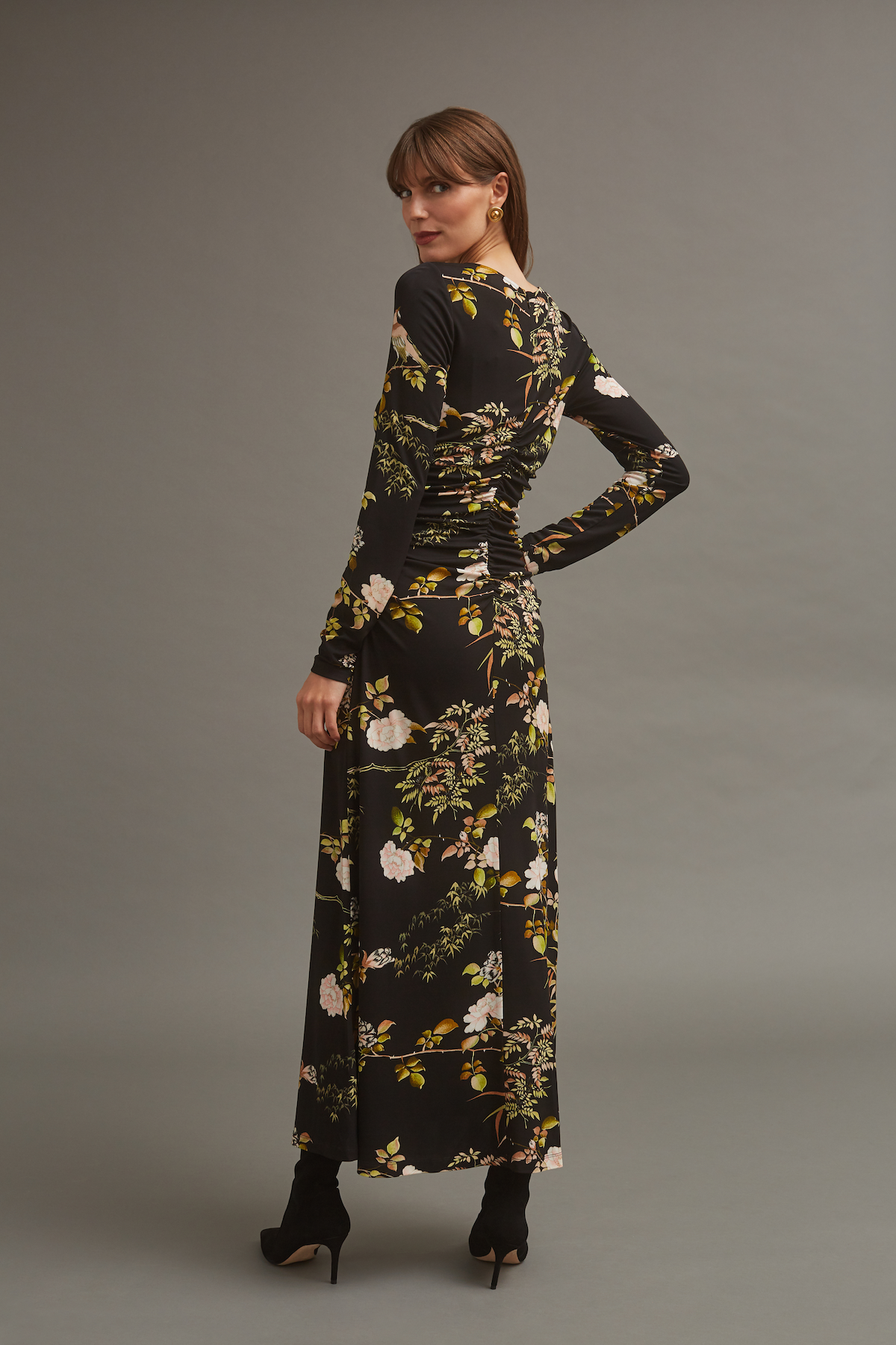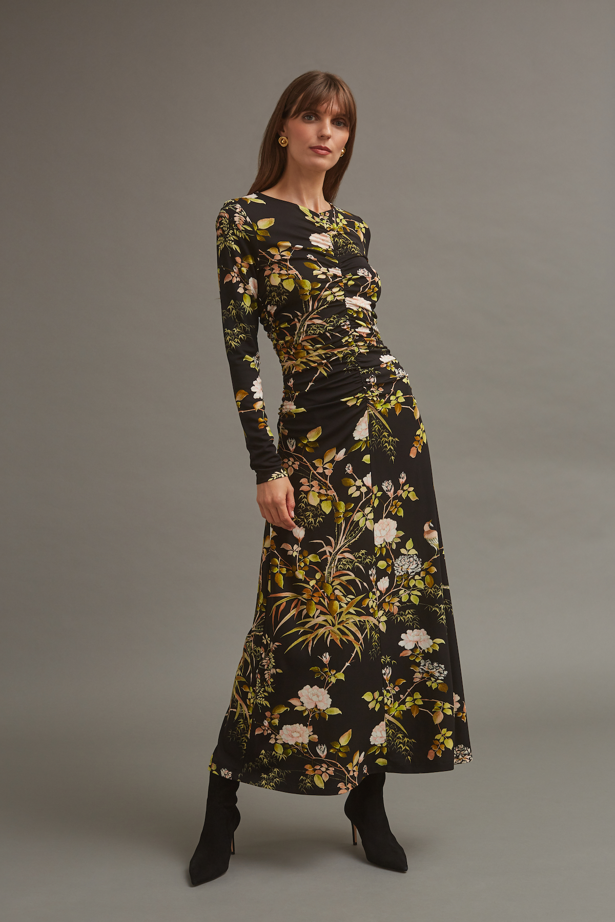 The Maisy Dress emulates chic freshness with a bold print. Rendered in sustainable slinky jersey, this flattering A-line midi’s ruched bodice and lean sleeves offer day-into-cocktail versatility for every occasion.