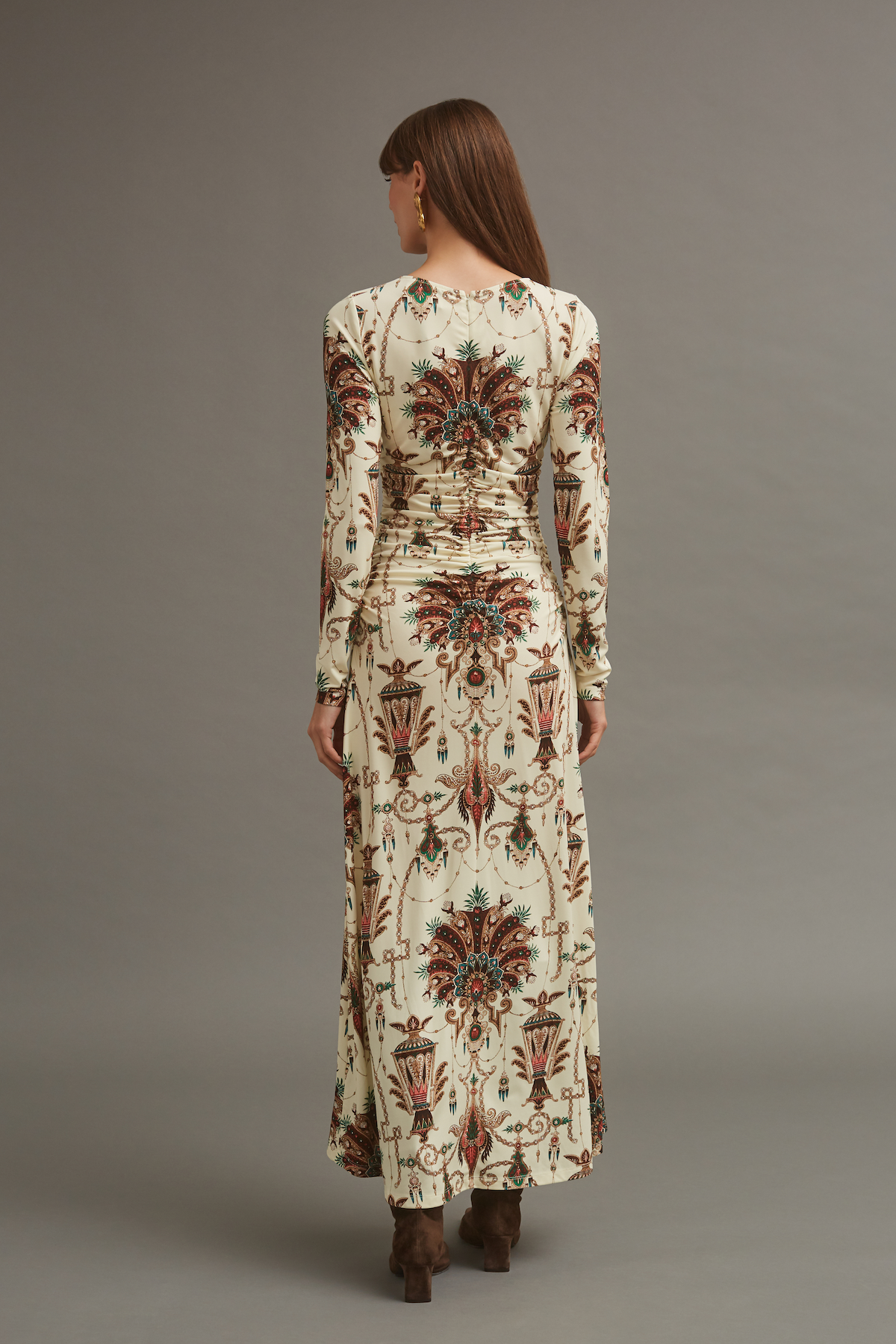 The Maisy Dress emulates chic freshness with a bold print. Rendered in sustainable slinky jersey, this flattering A-line midi’s ruched bodice and lean sleeves offer day-into-cocktail versatility for every occasion.