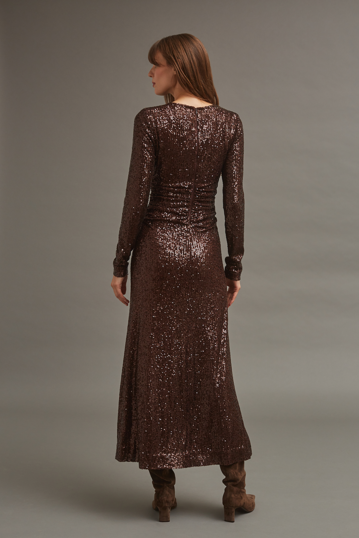 The Maisy Dress emulates chic freshness with a bold brown sequin.