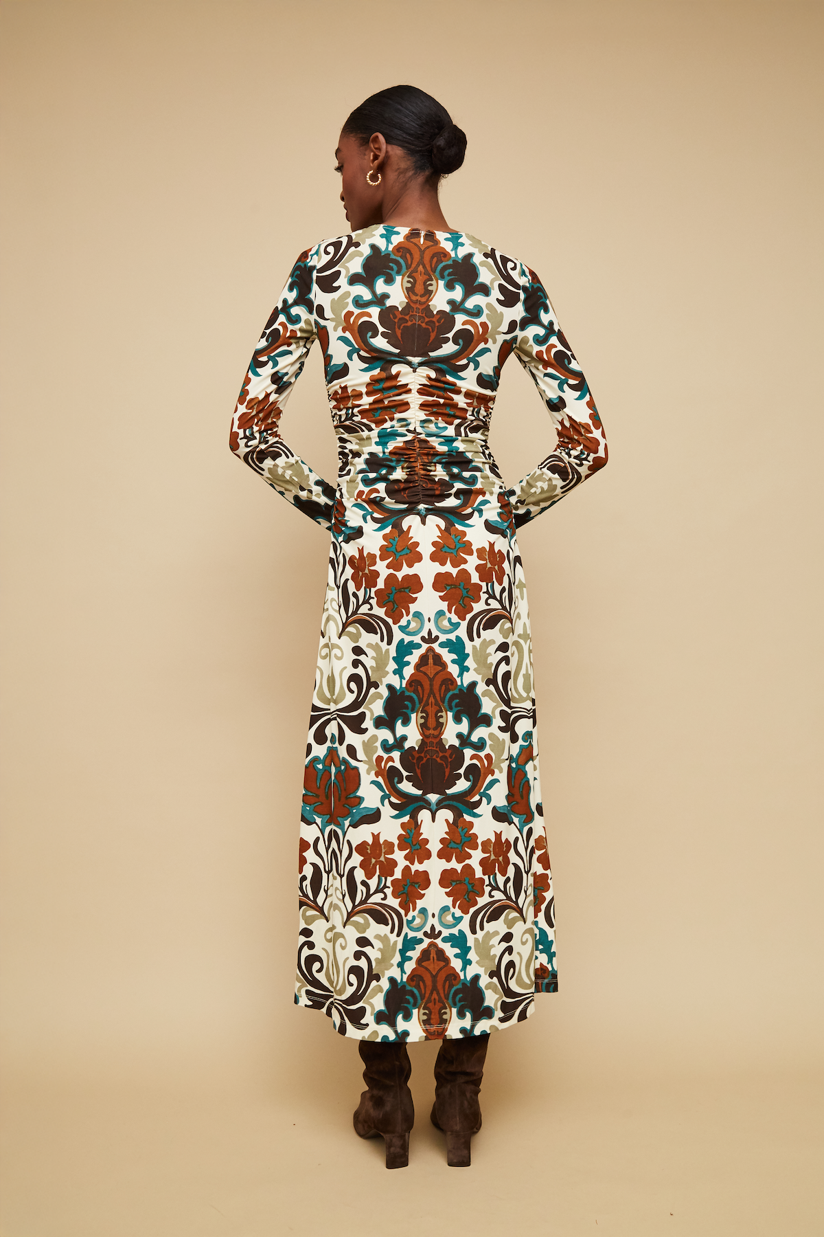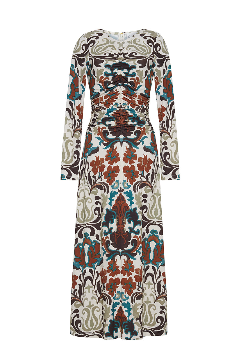 The Maisy Dress emulates chic freshness with a bold print. Rendered in slinky jersey, this flattering A-line midi’s ruched bodice and lean sleeves offer day-into-cocktail versatility for every occasion.
