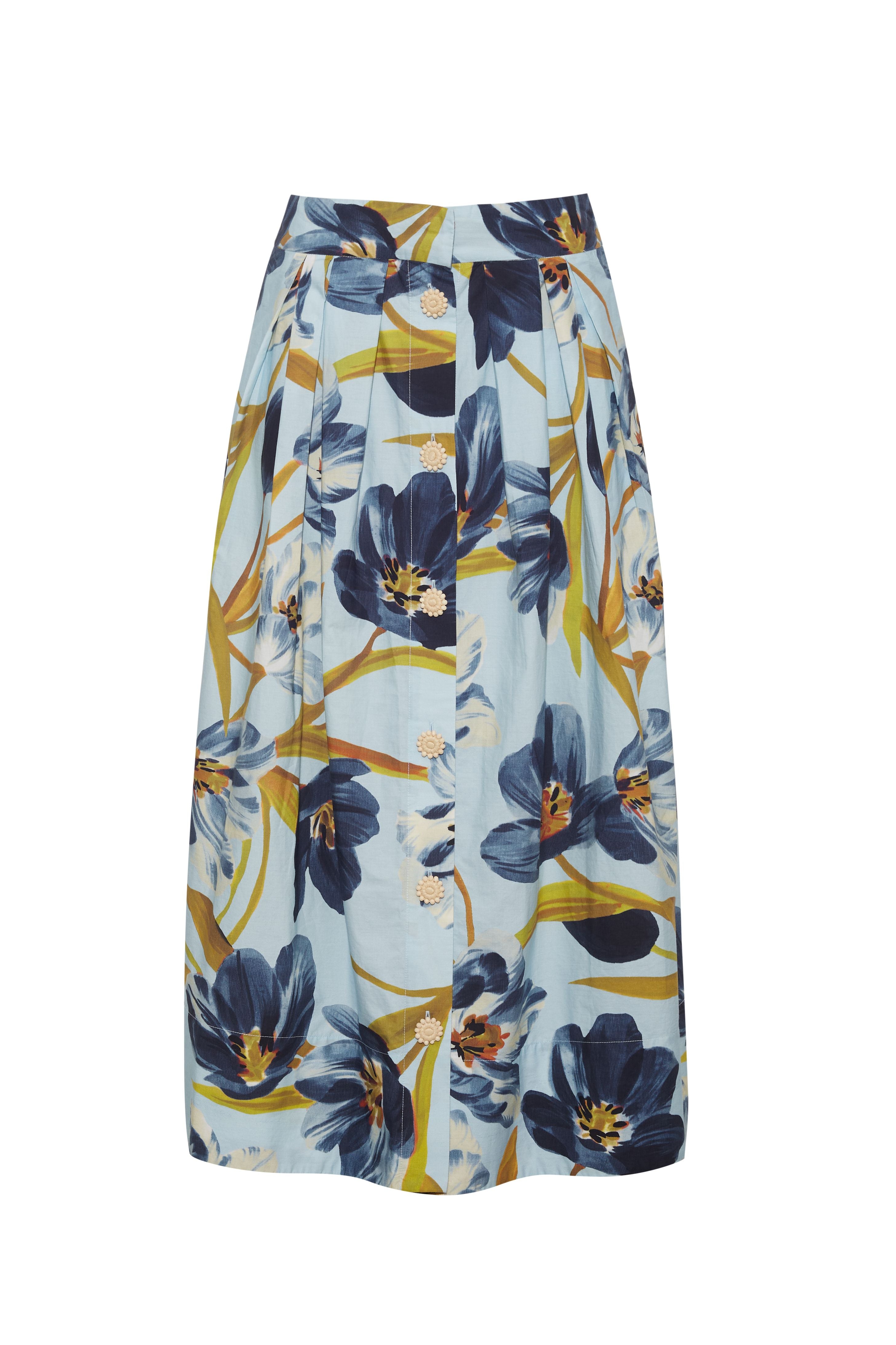 High-waisted skirt with buttons up front. Side slit pockets. Handmade novelty buttons. Pleat and tuck detail. Allover print. Unlined.