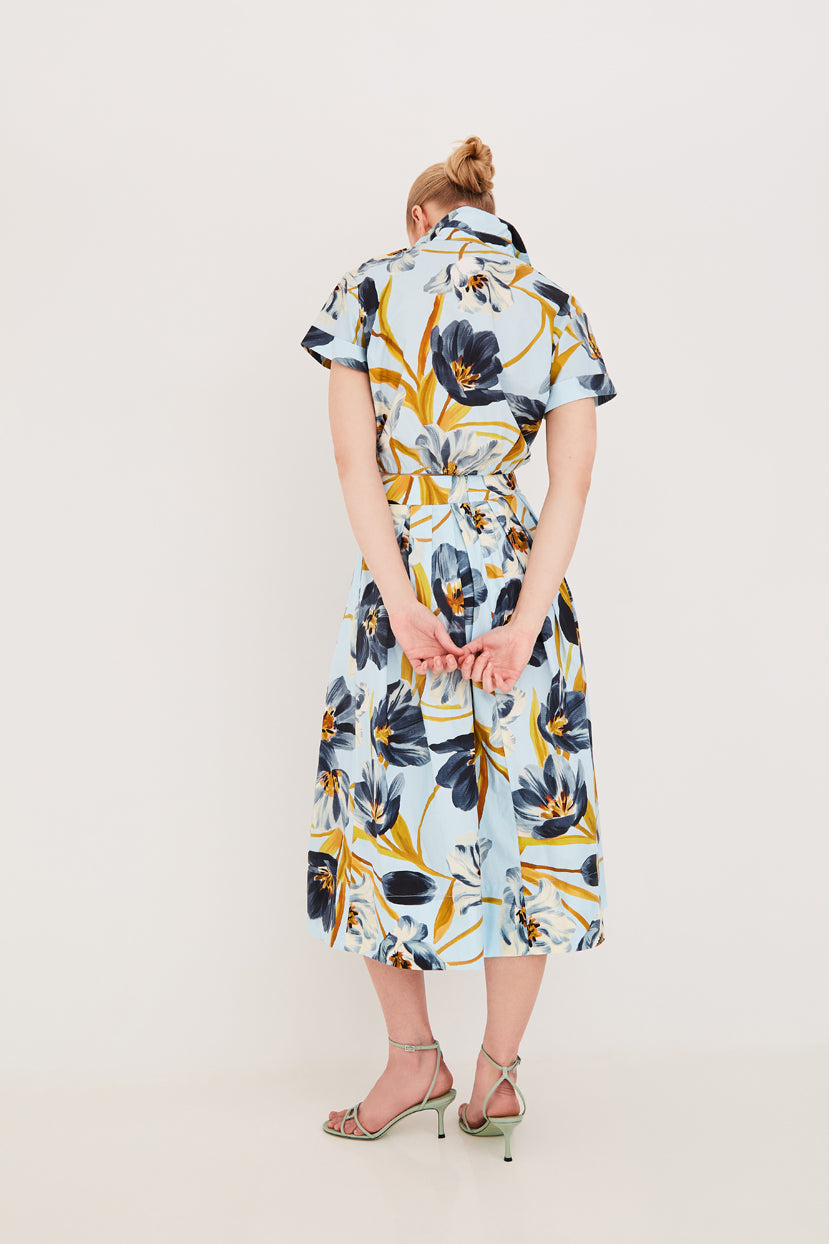 The beauty of the Marge Skirt is in its timeless simplicity. An effortless midi-silhouette cut in crisp cotton poplin, the functioning handmade novelty buttons add gorgeous texture against the vintage inspired floral print. Inspired by our favorite heroine, Marge Sherwood from The Talented Mr. Ripley, this piece feels like a sun-kissed holiday. Pair with a knotted white top or matching Asbury Top.