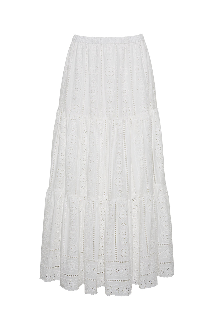 The Melanie is perhaps our most effortless skirt. The elastic waist and tiered silhouette flatter the figure and provide multiple styling options. Pair with our matching Perrin Top in the same eyelet for a fresh resort look or dress down with a white tee and kicks.