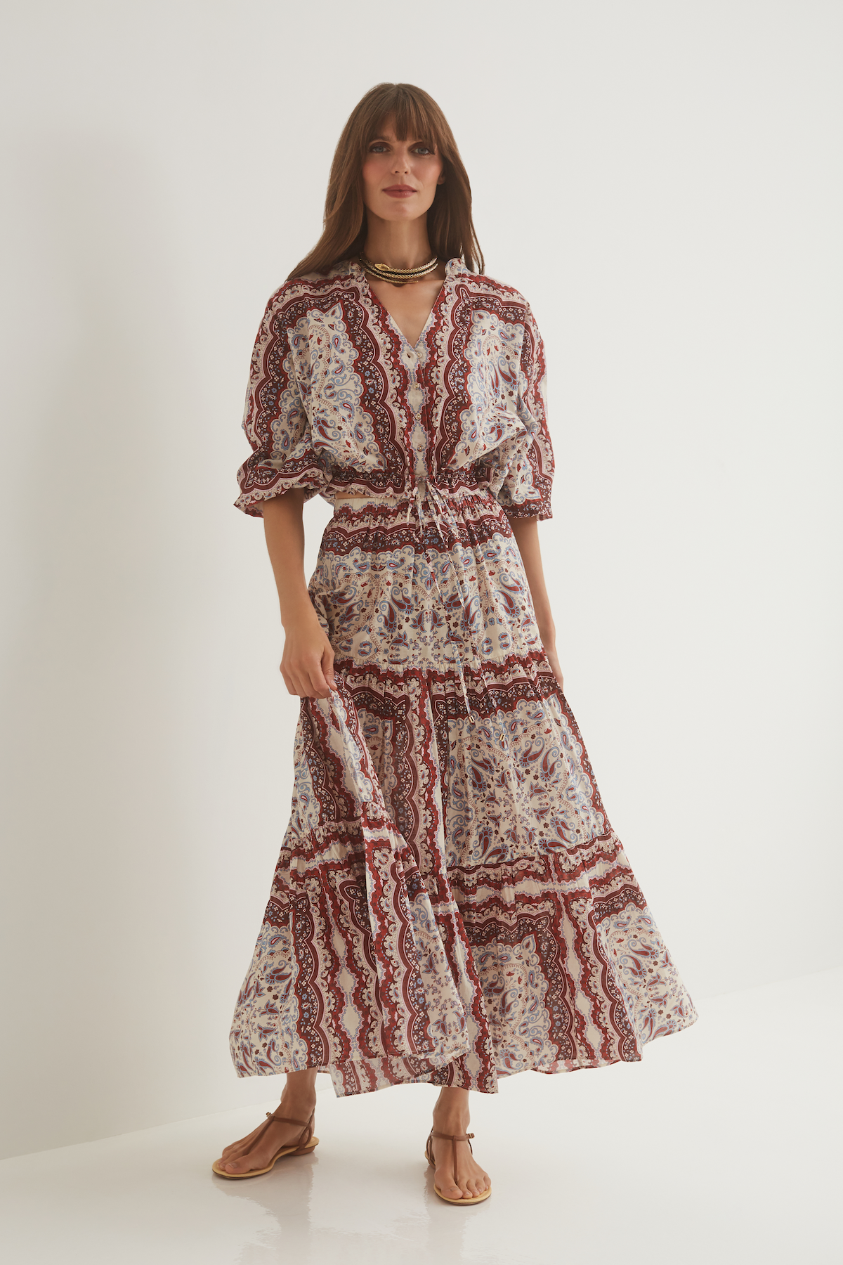 The Melanie in cotton voile is perhaps our most effortless skirt. The elastic waist and tiered silhouette flatter the figure and provide multiple styling options. Pair with our matching Perrin Top in the same print for a fresh look or dress down with a white tee and kicks.