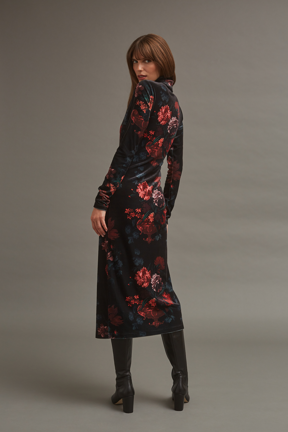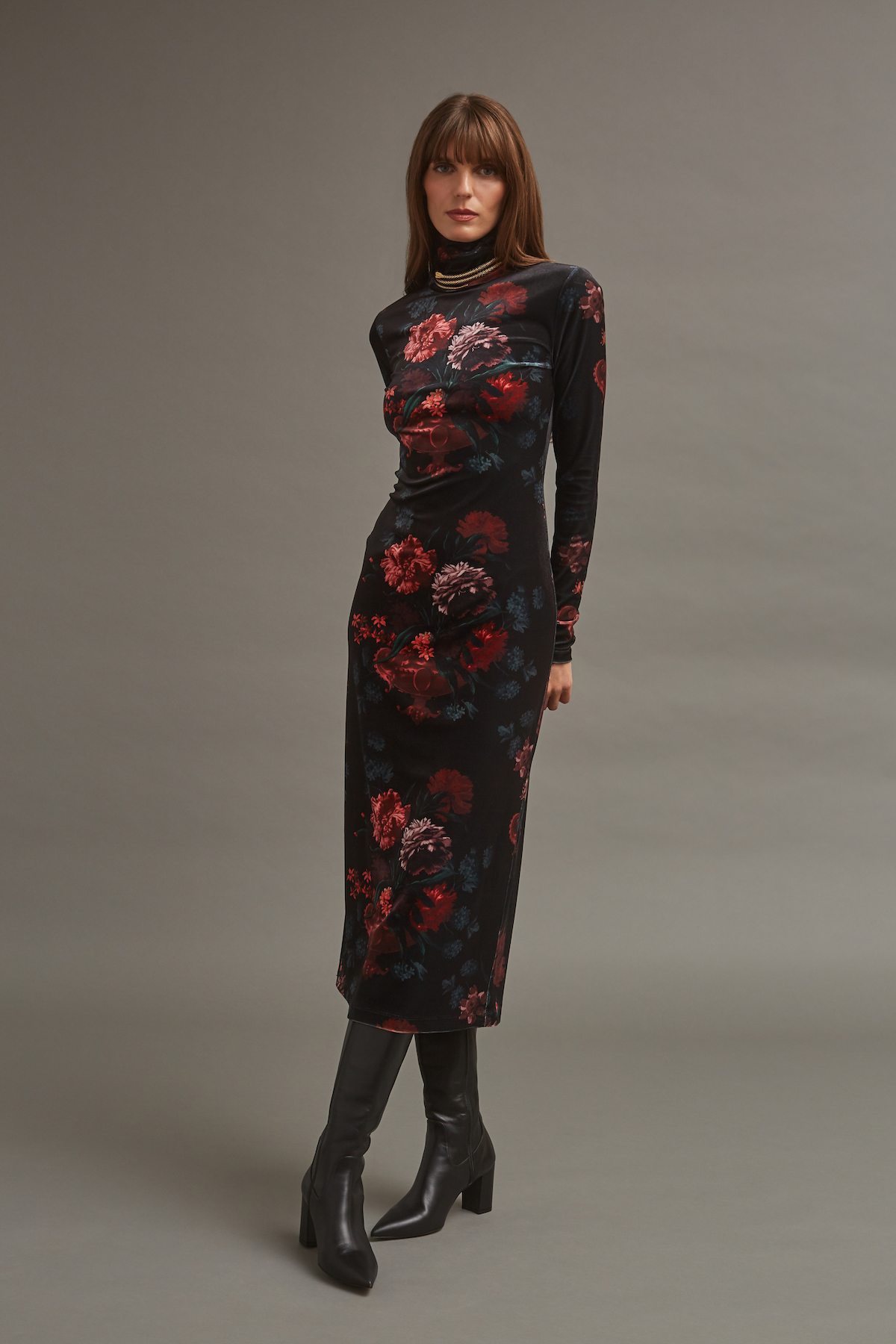• Turtleneck stretch-velvet long-sleeve midi dress