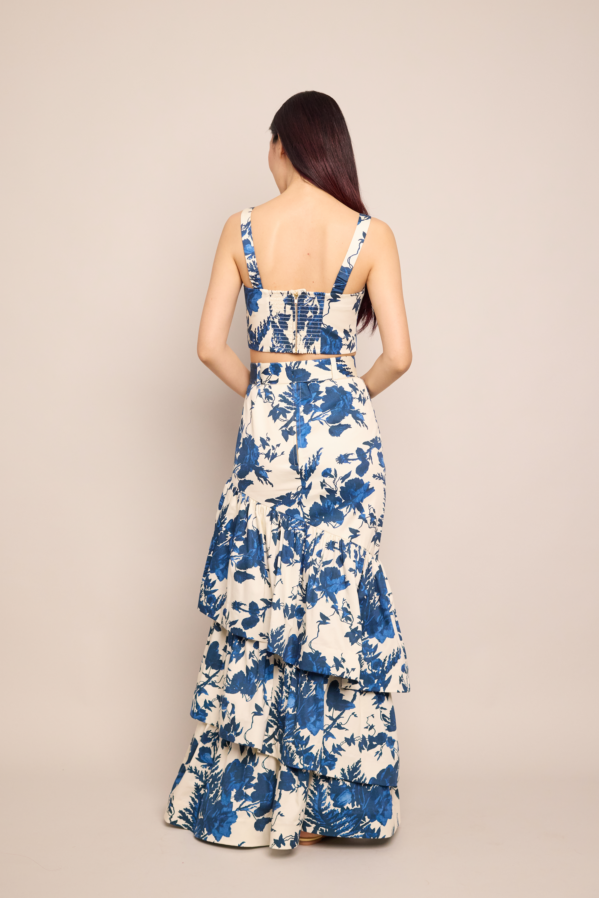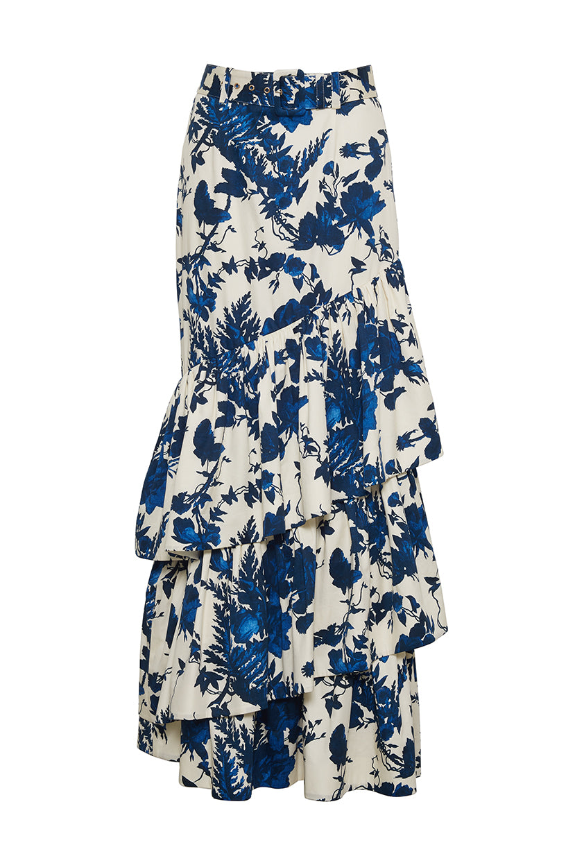 • Maxi asymmetrical fitted skirt with voluminous ruffles at tiers