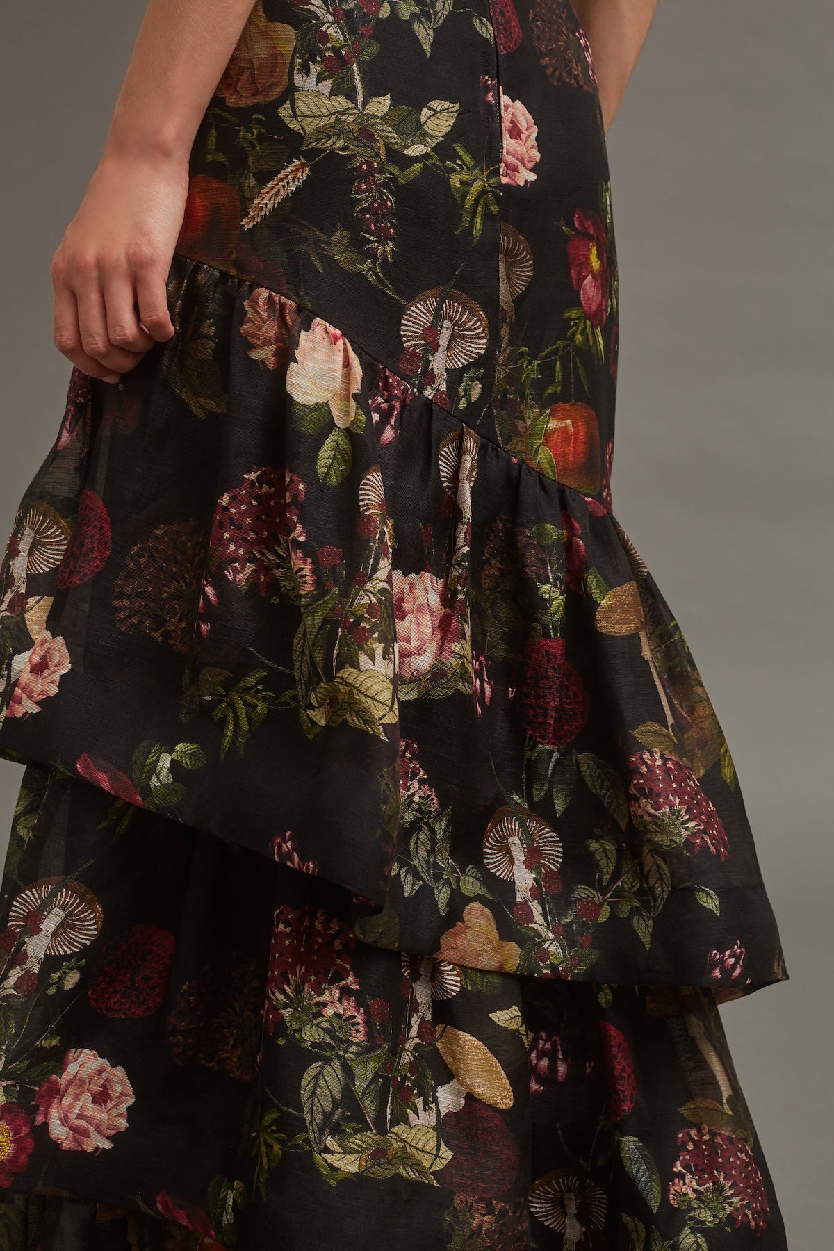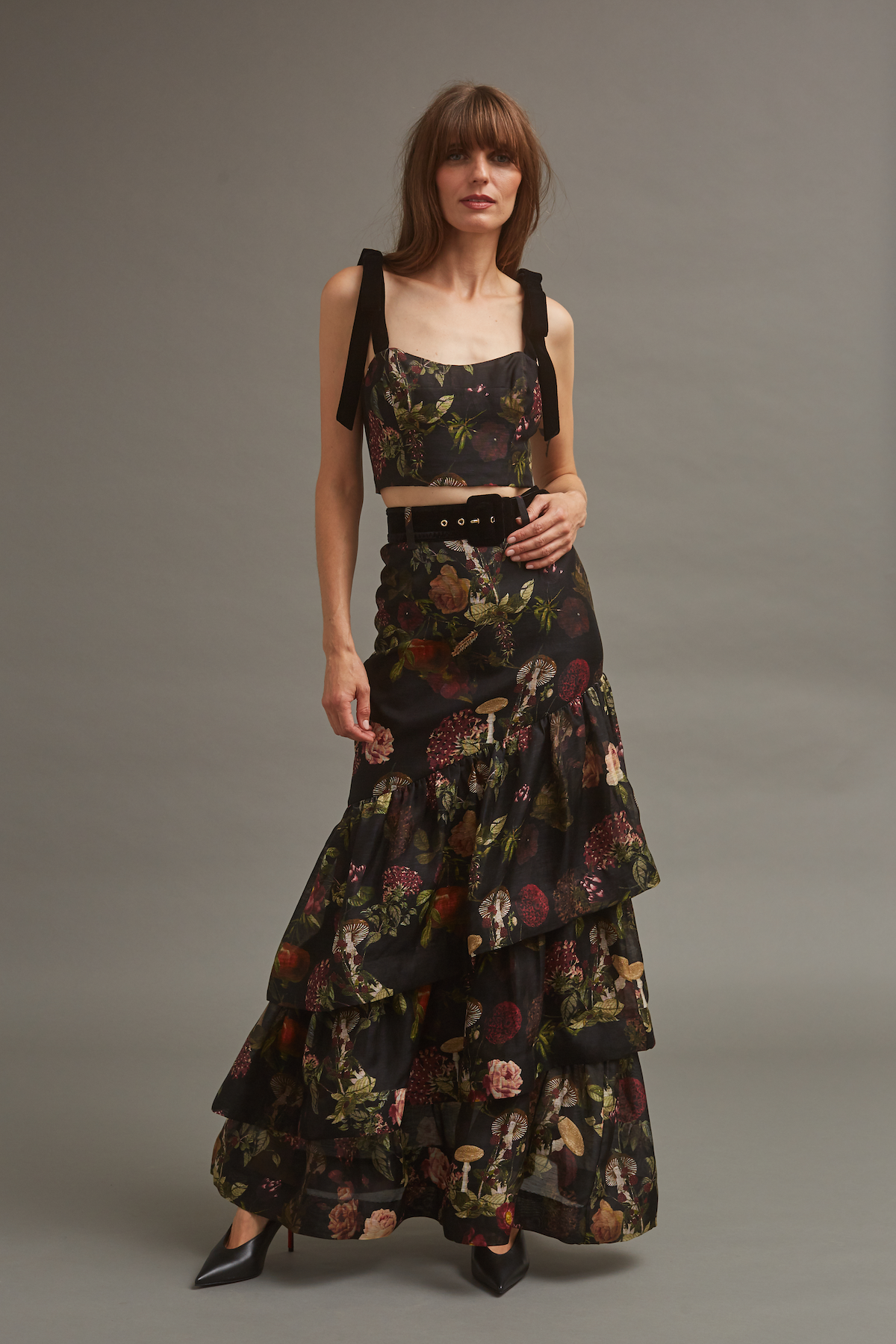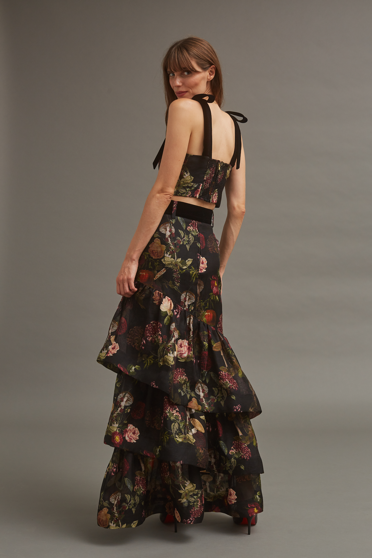 • Maxi asymmetrical fitted skirt with voluminous ruffles at tiers