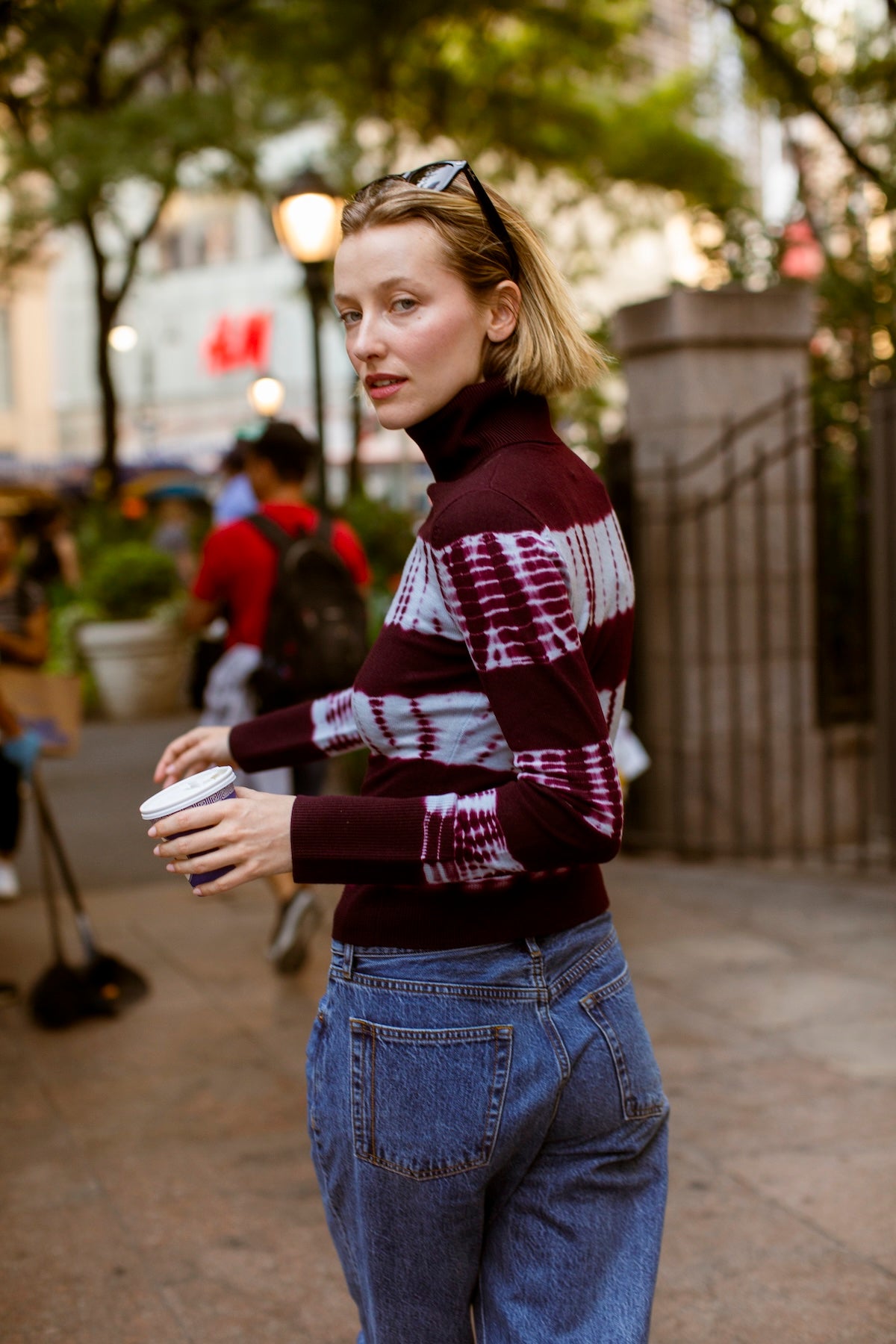 • Fitted long sleeve turtleneck with hand tie-dyed novelty knit