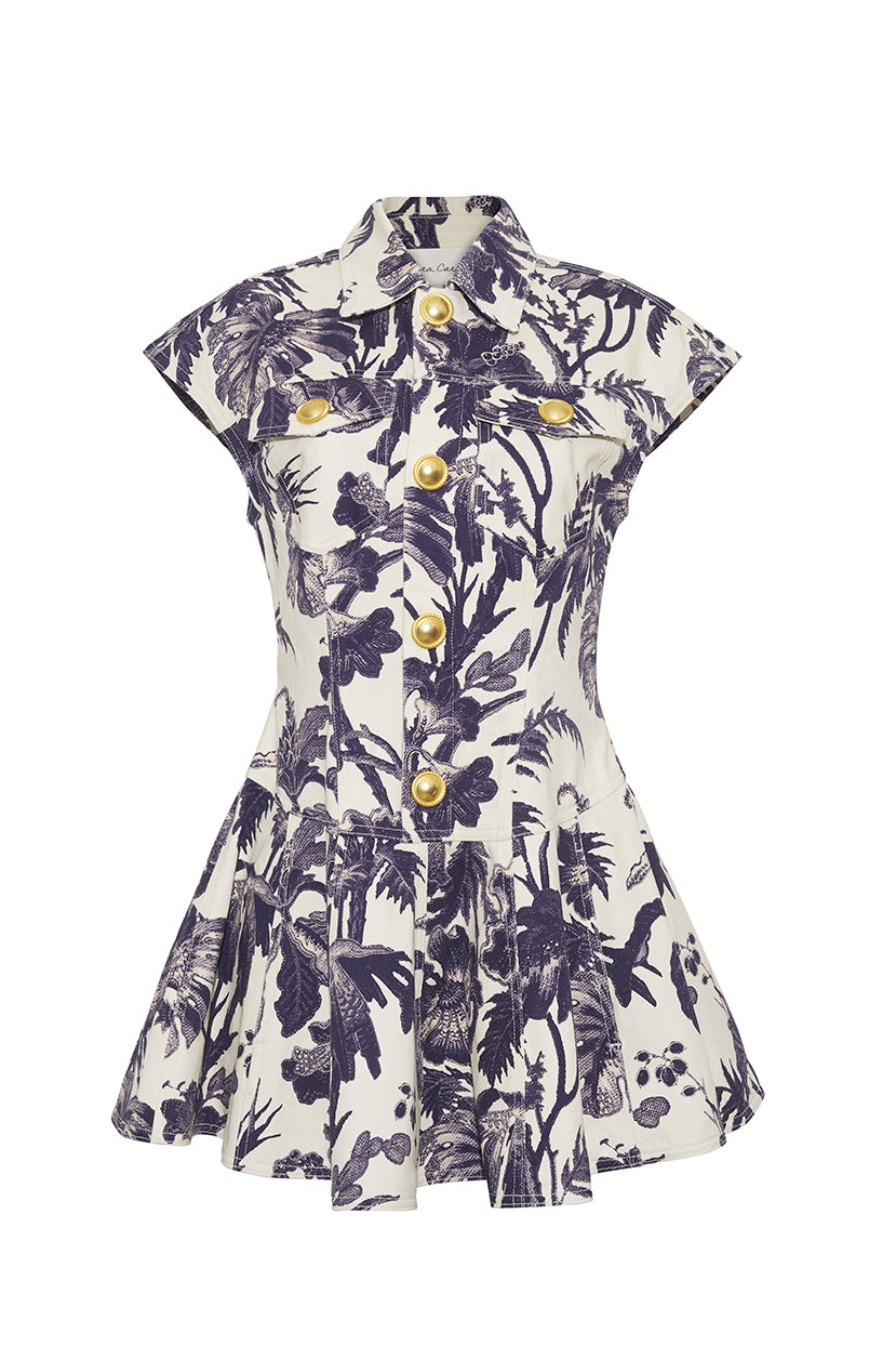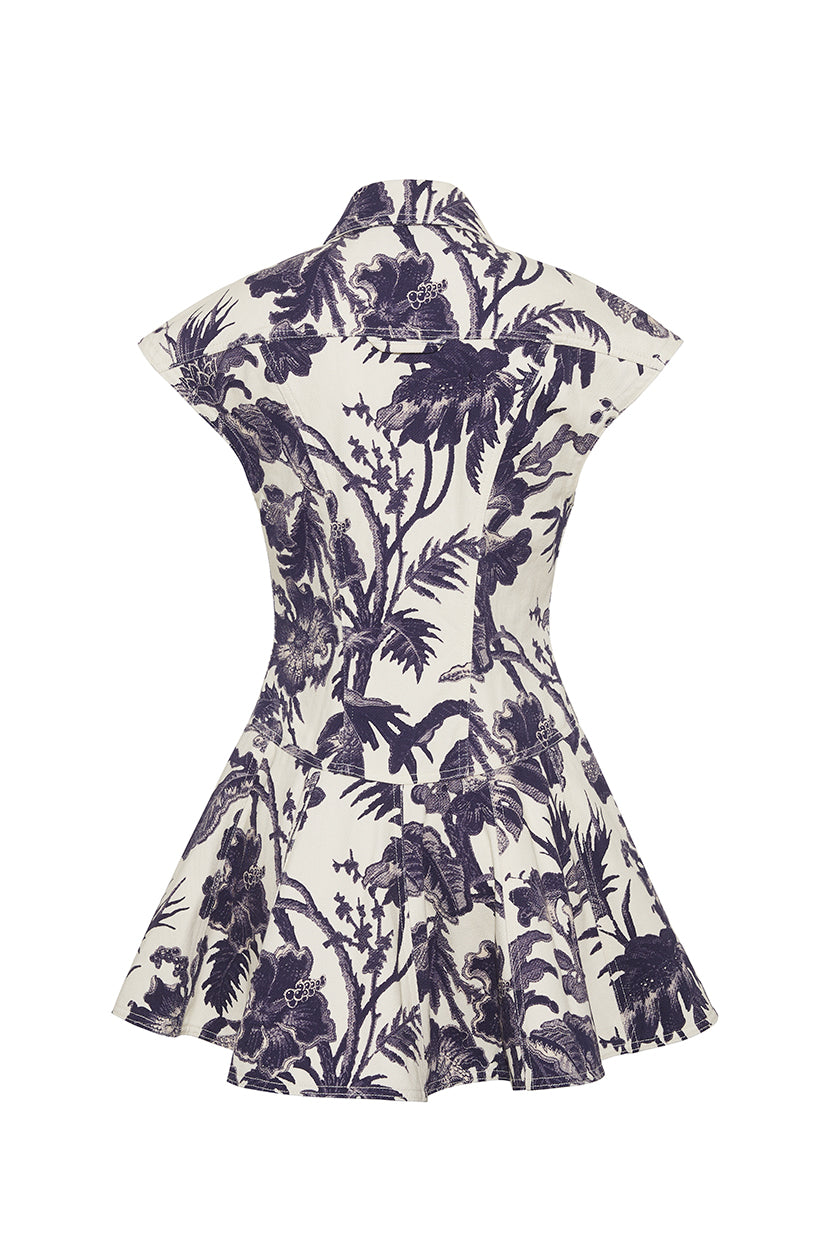 • Short sleeve, collared, button down fitted canvas mini dress with peplum skirt and seaming details throughout