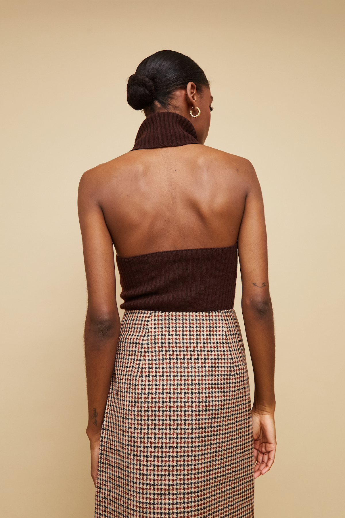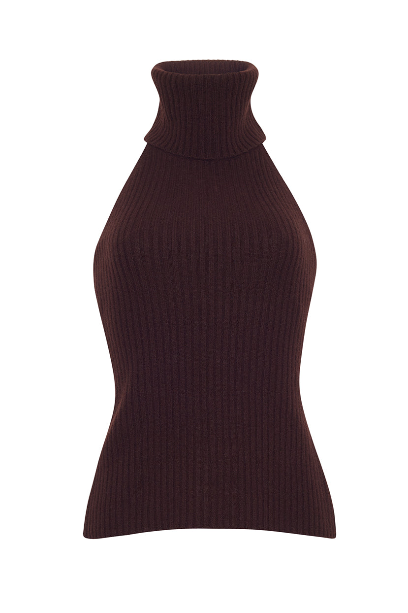 The form-fitting Samson Top is a ribbed knit open back halter with a luxurious, oversized turtleneck. The vertical rib knit stitch creates a figure-flattering silhouette.