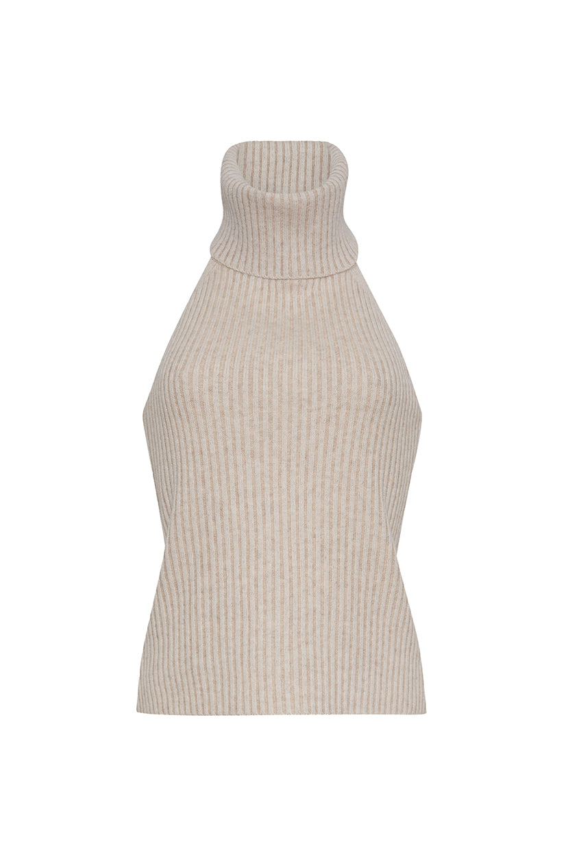 The form-fitting Samson Top is a ribbed knit open back halter with a luxurious, oversized turtleneck. The vertical rib knit stitch creates a figure-flattering silhouette.