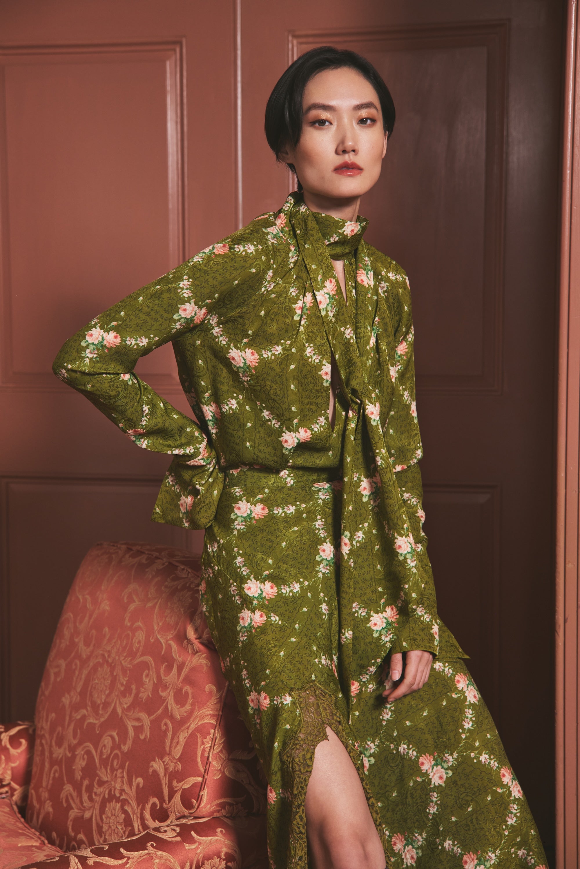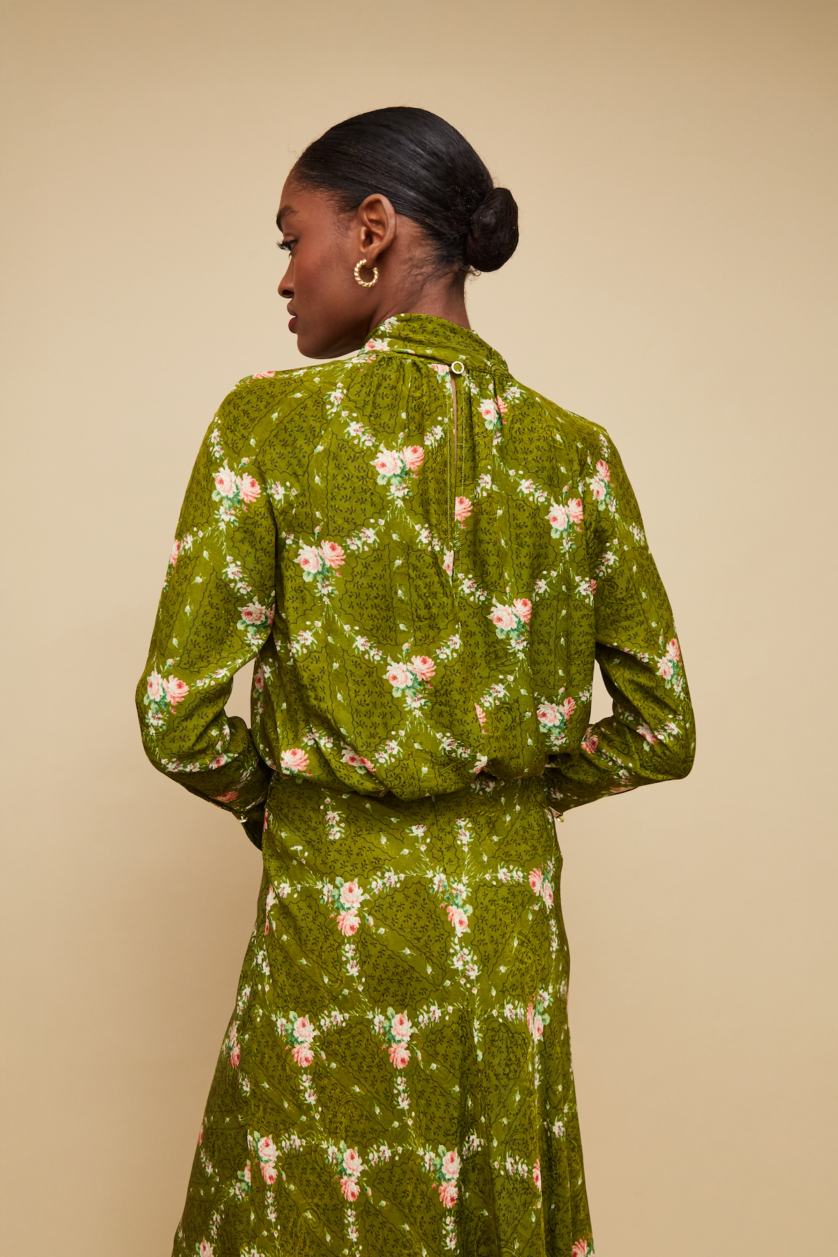• Center back slit at back with self covered shank button with gold rim detail for closure