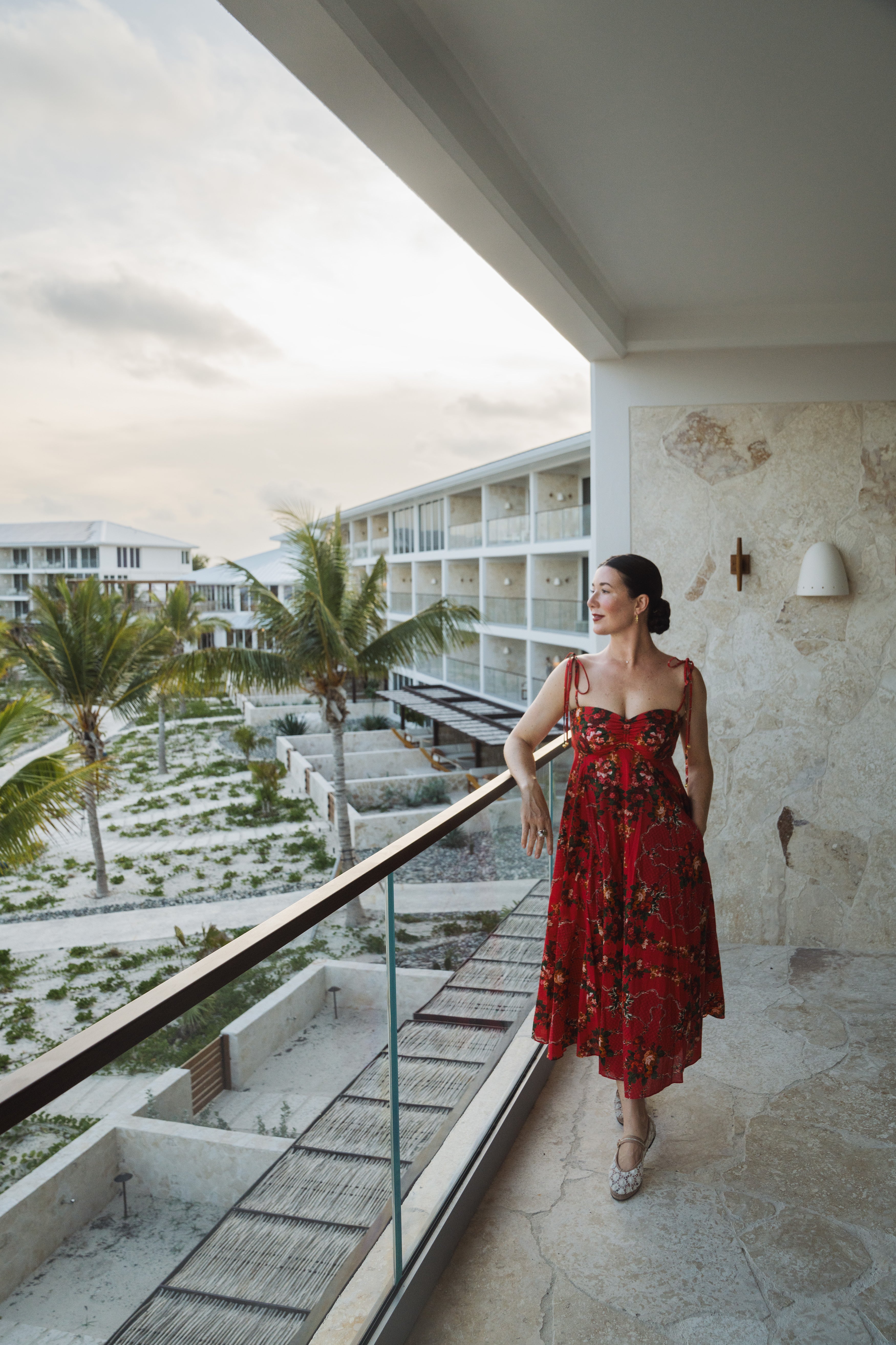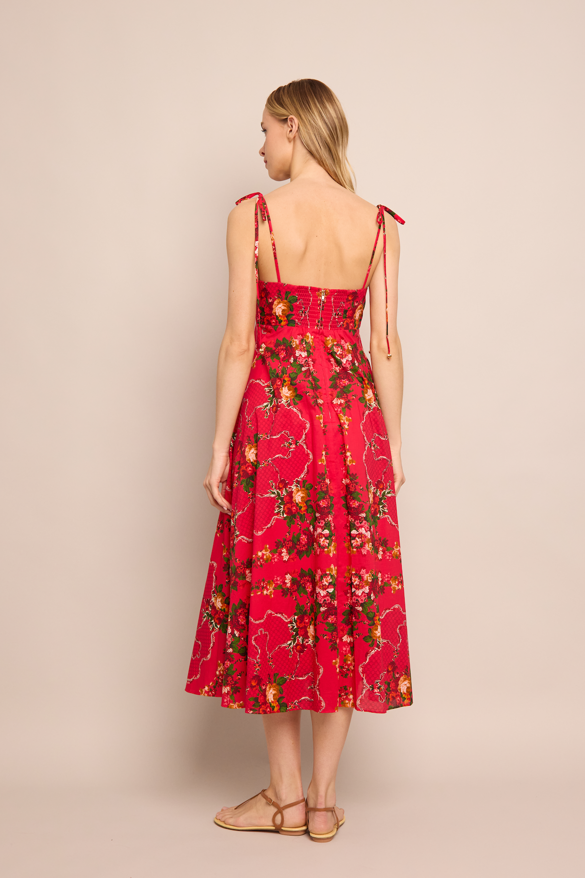 • Midi length dress with circle skirt and ruched bodice designed for a fit-and-flare look