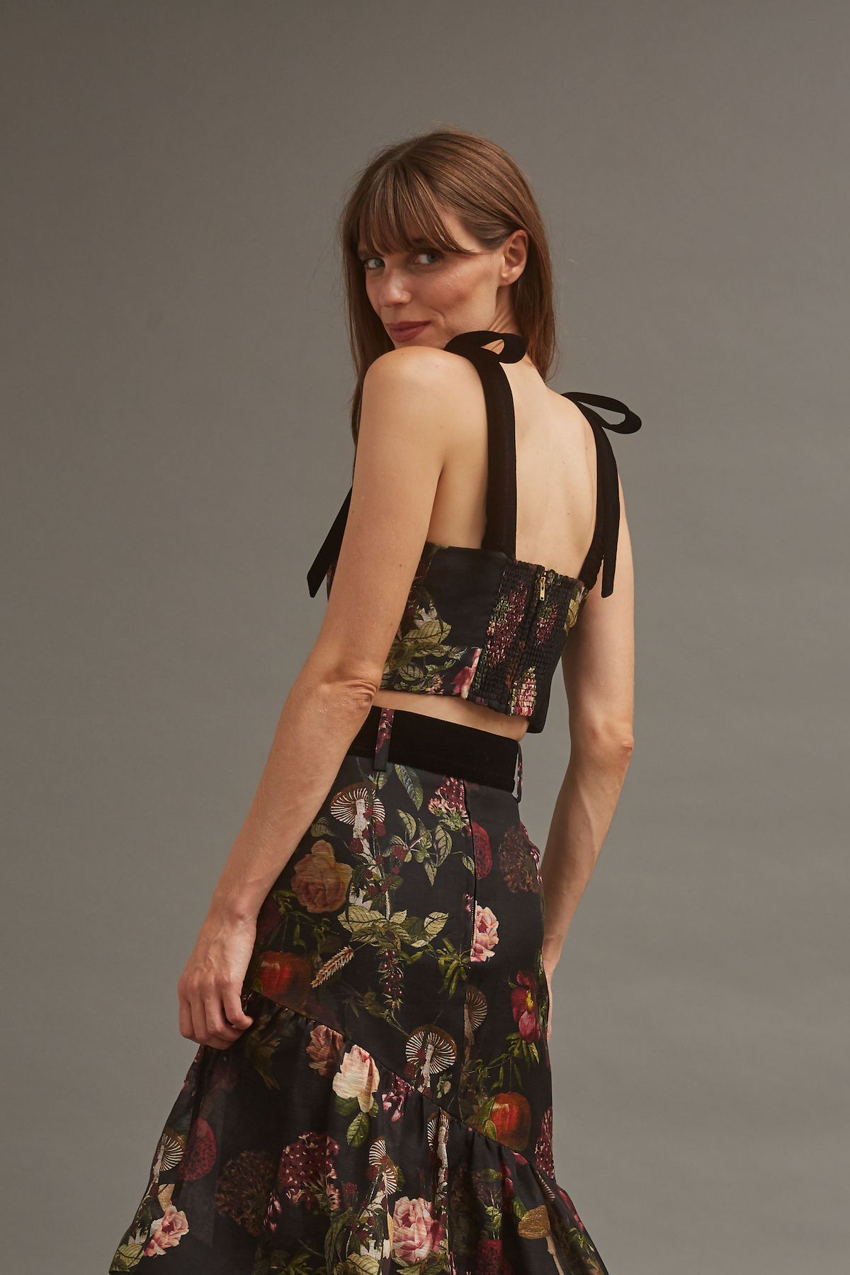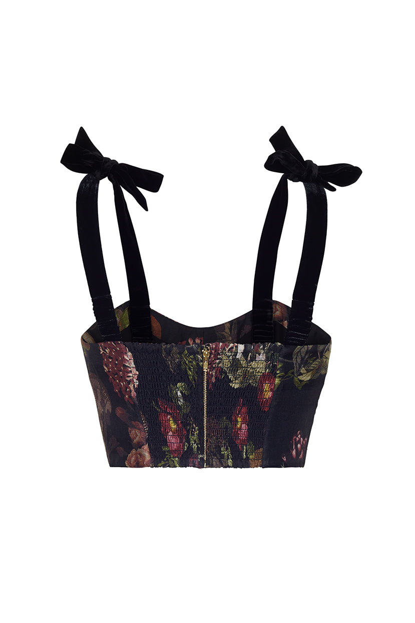 • Smocked back panel with gold metal zipper and hook-and-eye closure