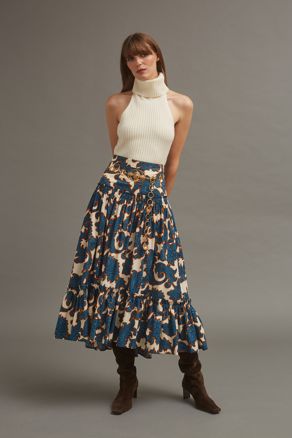 The Tisbury Skirt balances a bohemian spirit with a polished fit. The high-low, tiered ruffle skirt has just enough volume to feel special while being casual enough to knot your favorite t-shirt on top for a playful look.