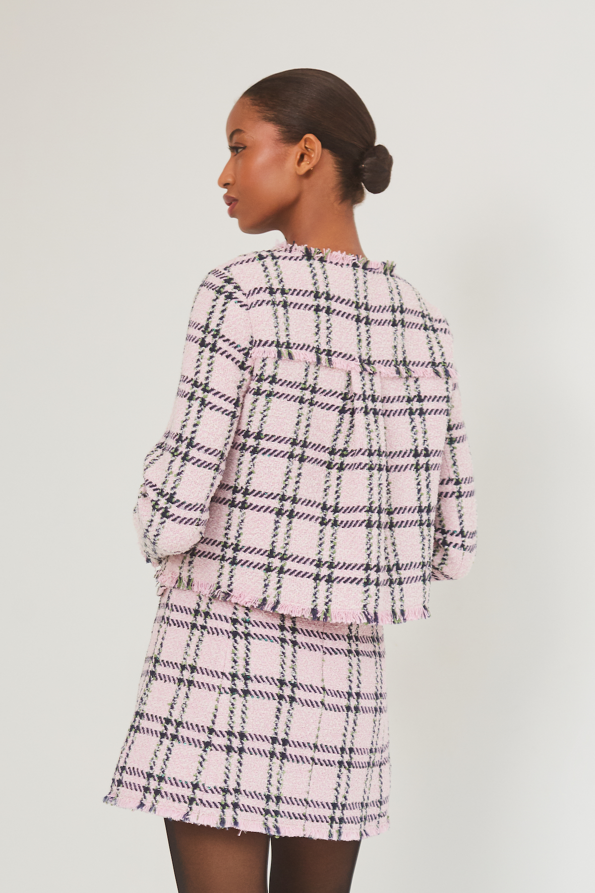 • Boxy jacket in pink boucle tweed with frayed edges at all openings and yoke seam